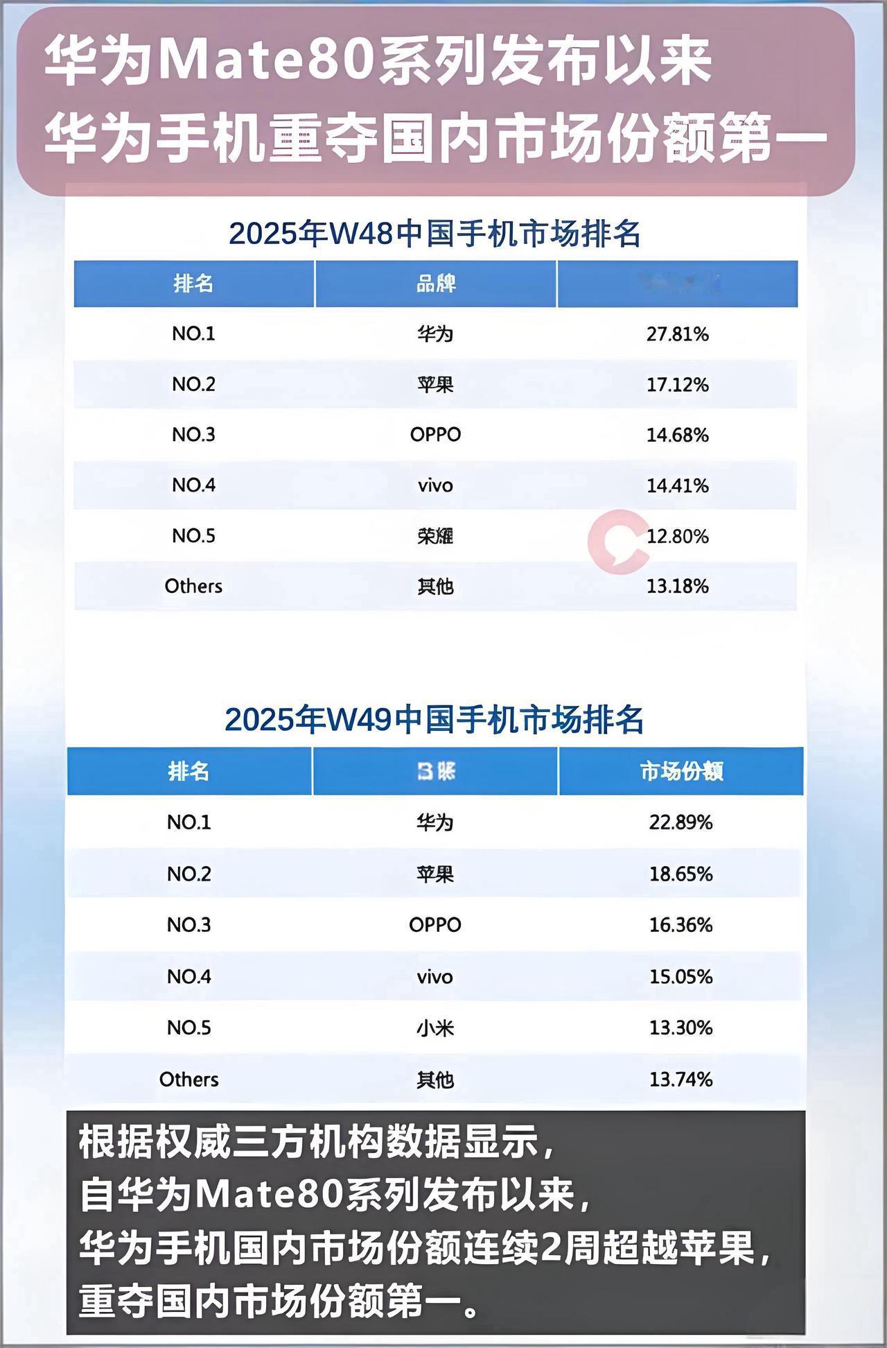 华为王者归来?连续2周斩获中国第一! 刚刚!据权威第三方市场机构统计数据,2025年第48、49周,华为手机重夺国内市场份额第一!一扫三季度销量份额的阴霾! 而且注意,不是微幅领先第二名,是大幅拉开了与亚军苹果的差距,尤其第48周,超过了苹果10个百分点,49周也超过4个百分点了 ,比苹果与小米OV的差距都要大一个level~ 该说不说,Mate80系列立功了,余承东嘴都要笑歪了,看来,只要定个合适的价,Mate系列一直不愁没人买的!你们觉得呢?