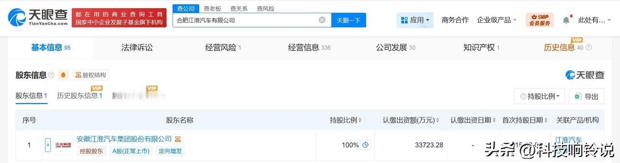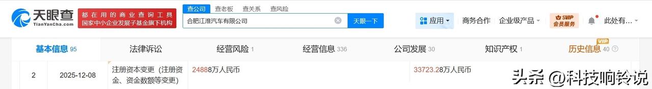 【合肥江淮汽车公司增资至3.37亿 增幅约35%】 天眼查工商信息显示,近日,合肥江淮汽车有限公司发生工商变更,注册资本由约2.49亿人民币增至约3.37亿人民币,增幅约35%。 该公司成立于1996年7月,法定代表人为赵宁刚,经营范围为生产和销售自产的载货汽车、农用车及其零部件,土地、房屋、设备、汽车租赁,为企业采购、投资、招商、管理提供信息咨询服务,物业管理。股东信息显示,该公司由江淮汽车(600418)全资持股。 天眼查信息: