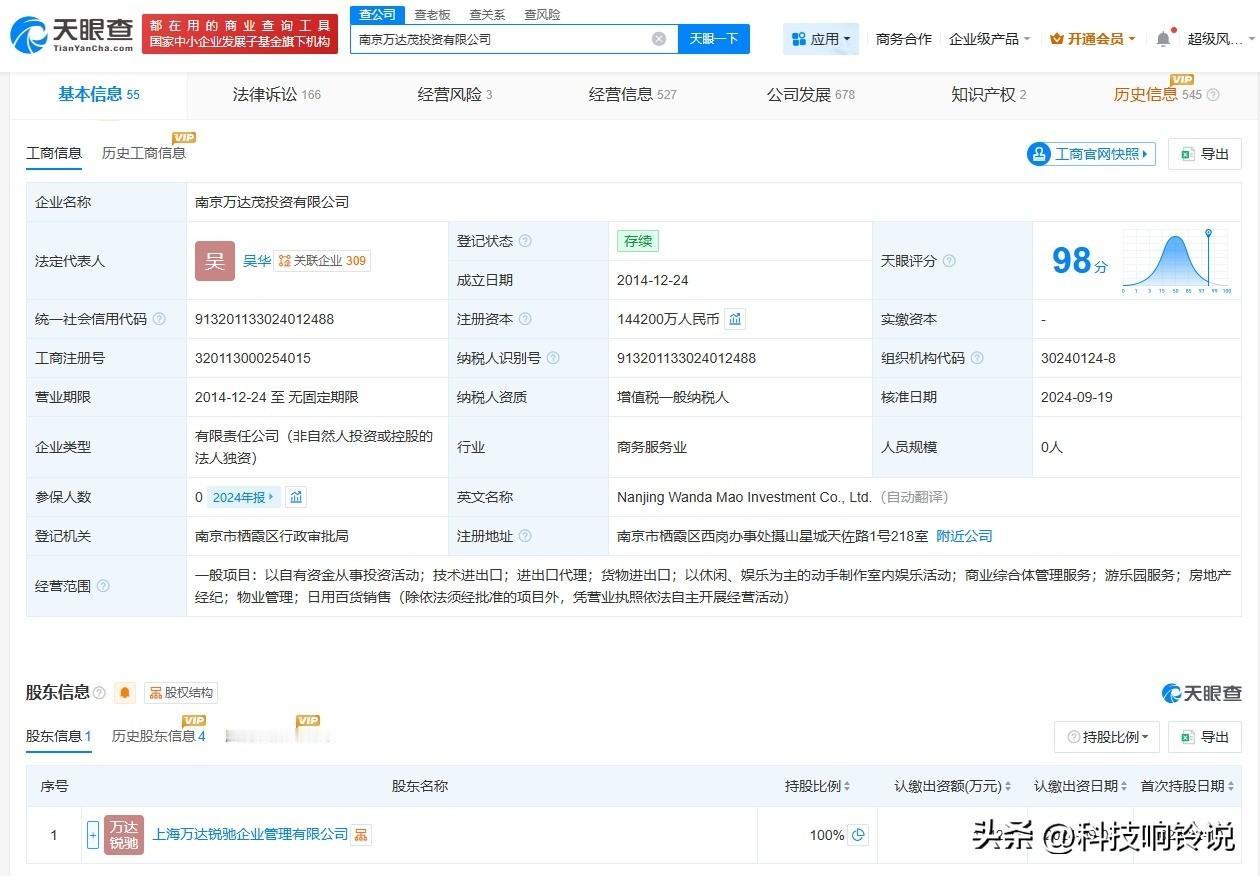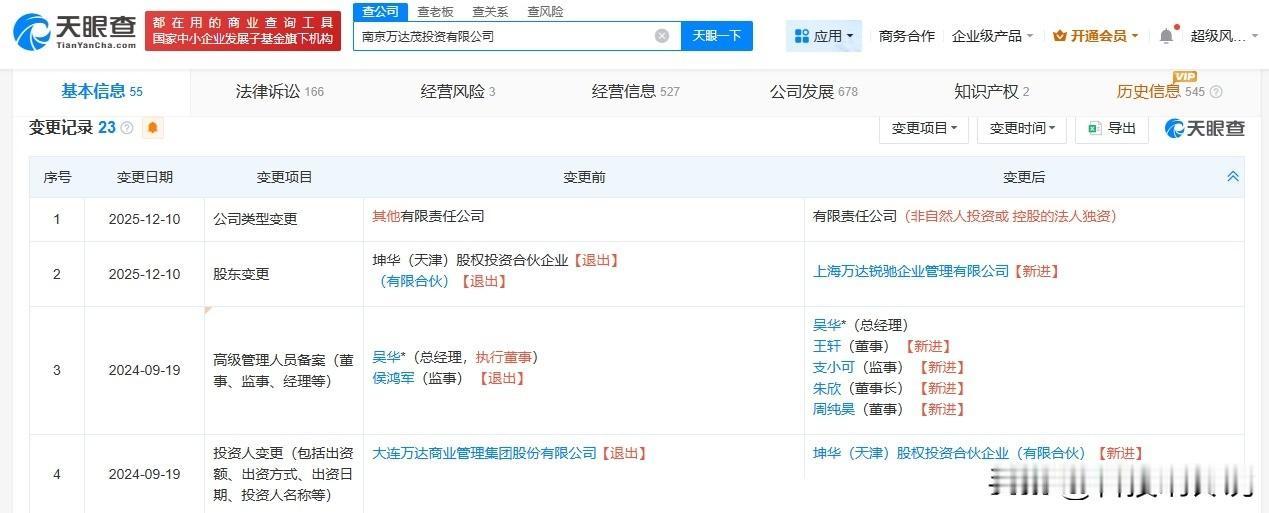 【万达赎回南京万达茂投资公司 万达集团赎回南京万达茂】 天眼查App显示,近日,南京万达茂投资有限公司发生工商变更,原股东坤华(天津)股权投资合伙企业(有限合伙)退出,新增上海万达锐驰企业管理有限公司为全资持股。变更记录显示,2024年9月,大连万达商业管理集团股份有限公司将该公司股份转让至坤华(天津)股权投资合伙企业(有限合伙)。 值得注意的是,近日,上海万达锐驰企业管理有限公司接手烟台芝罘万达广场有限公司,随后又将该公司股份转让至苏州联商玖号商业管理有限公司。 天眼查信息: