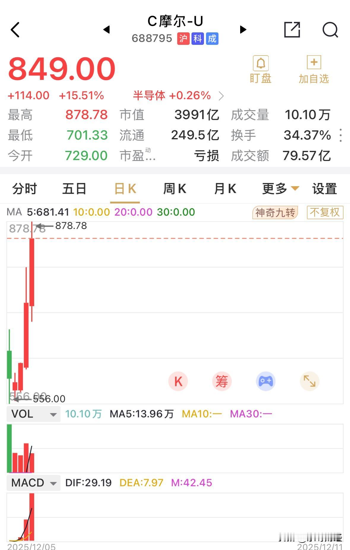 又是大阳线,上市5个交易日,除了首日大涨425%,其余4个交易日均为阳线,以摩尓线程的这种涨速,估计不用多久时间,股价就可上1000元了! 摩尔线程总股本4.7亿股,届时市值将逼近5000亿元关口。 其上市之初对自己身的估值仅300-500亿元,这估值直接往十倍级涨。 据经济大师言,资本市场总是对的,涨有涨的道理。 但是,摩尔线程一旦回调,估计对半导体行业的其他个股走势来说,将是一件非常困难的事情。 乐呀财经