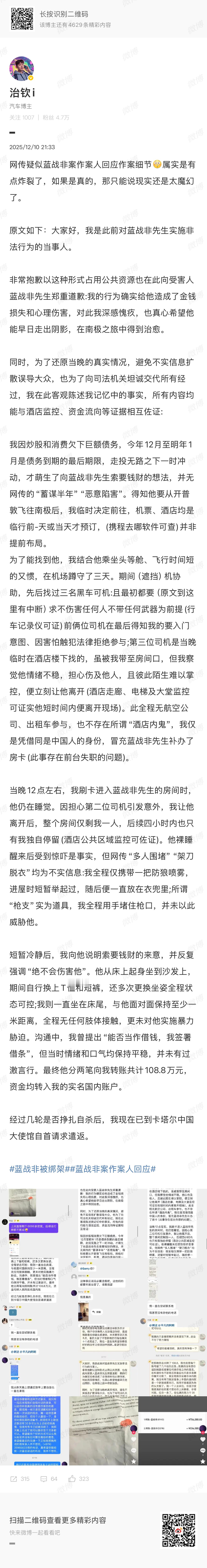 绑架蓝战非的本人,竟然回应了,你敢信吗,到底谁在说谎,现在还不能下定论,让子弹再飞一会儿,再等等蓝战非被绑架蓝战非案作案人回应