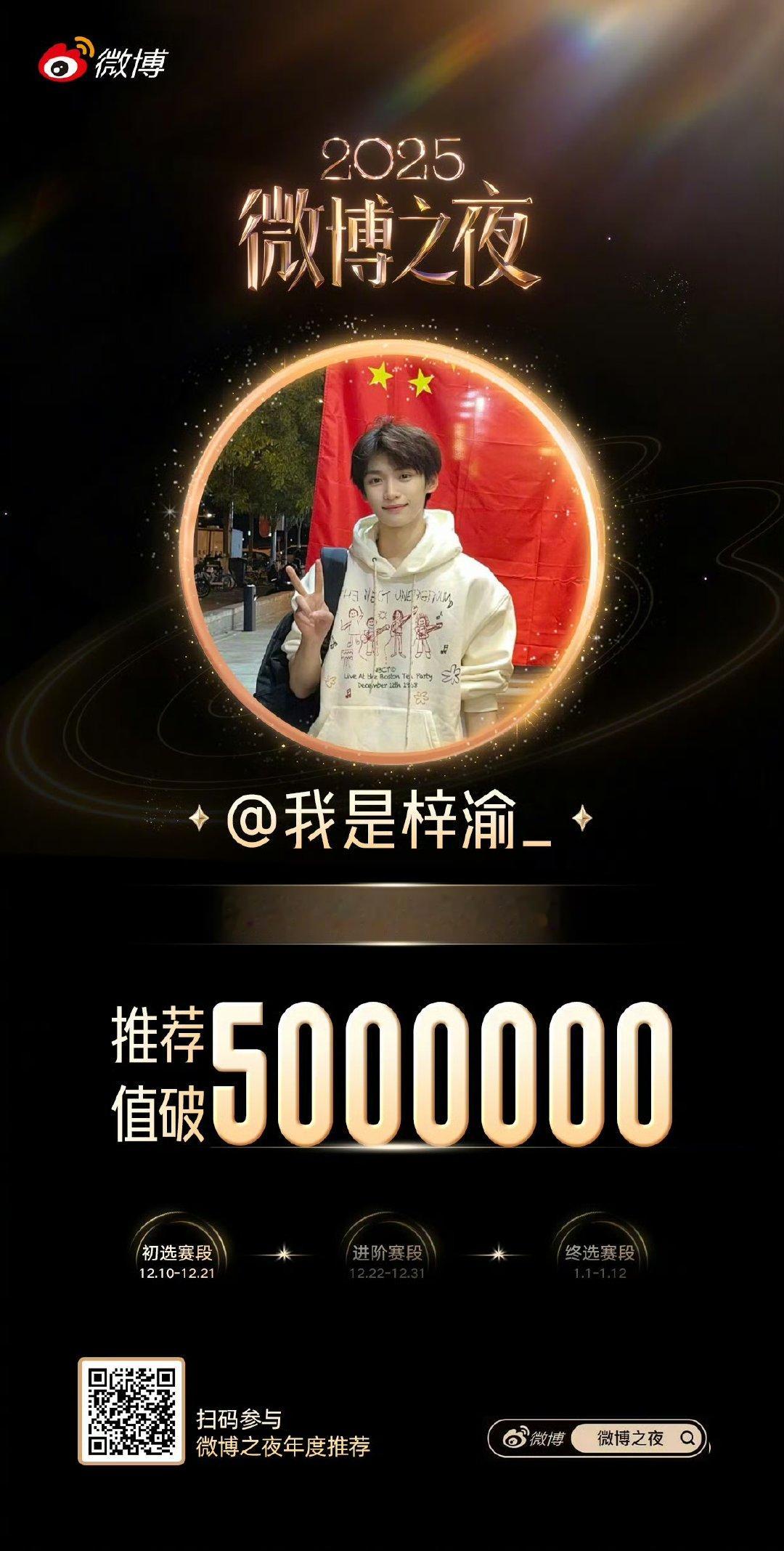 梓渝星光人物初选赛推荐值破500万恭喜在微博年度星光人物 初选段评选中,推荐值突破500万!