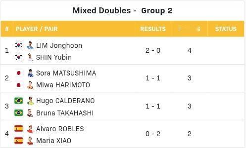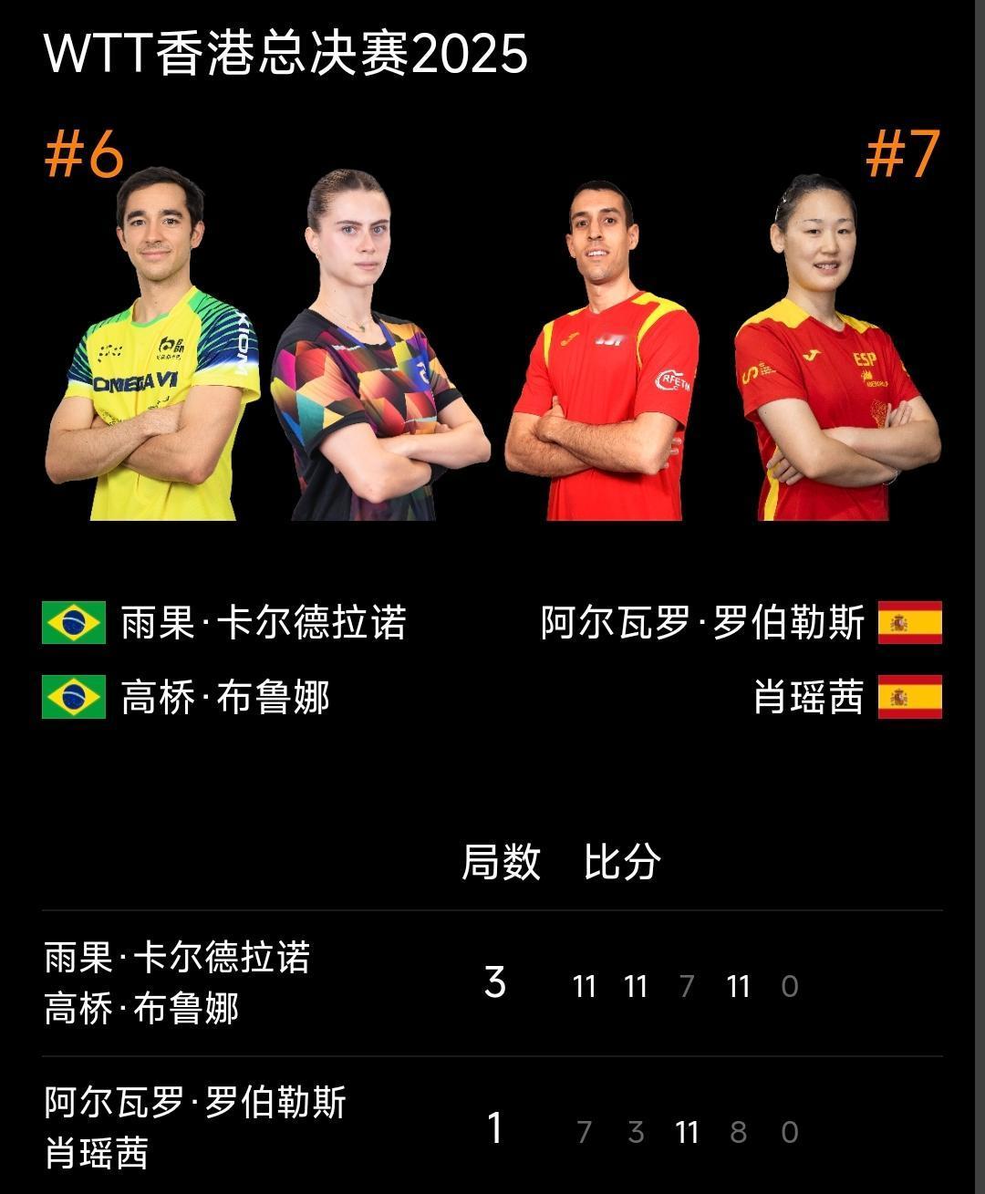 雨果/高桥布鲁纳获小组首胜! WTT香港总决赛2025 混双小组赛,巴西组合以大比分3比1战胜了西班牙组合罗伯勒斯/肖瑶茜,取得小组赛首胜,两战过后巴西组合以一胜一负战绩与日本组合松岛辉空/张本美和并列第二,谁能出线就看明天相互之间的对阵结果,谁胜谁出线! 韩国组合林钟勋/申裕斌两连胜可确保已出线!