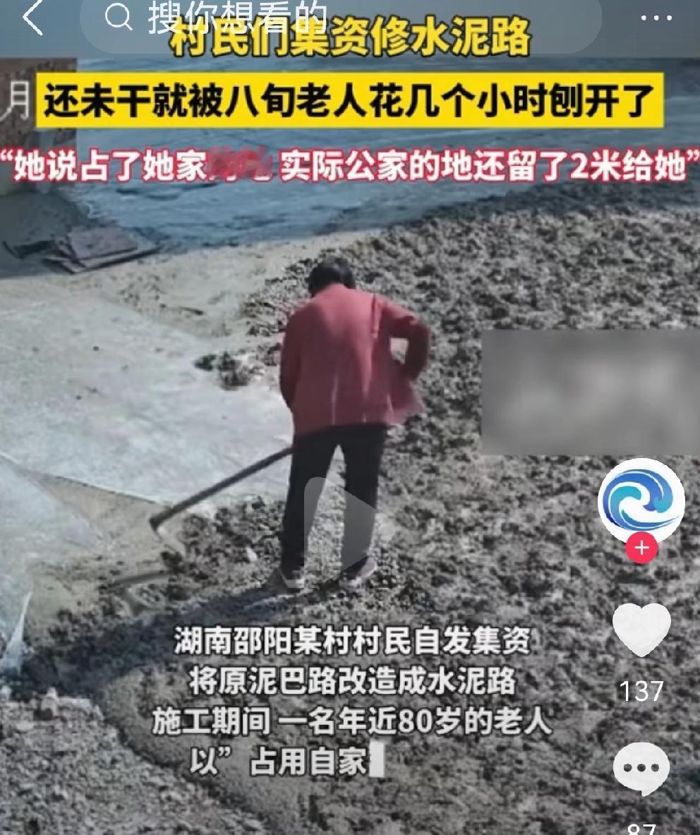 老脸不要了! 湖南邵阳一村里,村民们从牙缝里抠出来的钱,集资修水泥路! 路面硬化,刚把水泥抹平,还没有干。 这个八旬老太婆,就拿把锄头开始挖路。不知道哪里来的那么大的劲儿,锄头挥舞,一会儿功夫,就把平展展的水泥路挖的稀巴烂。 老太太还理直气壮:占了她家的地! 村委会回应:实际公家的地,还给她家留了两米。 看背影,这老太太确实也是村里的泼妇。八十多岁,还这么凶悍撒泼! 看来,不是老人变坏了,而是有人天生骨子里就不善! 咋处理?八十多岁的老人,能拿她怎样? 让她出钱修路,恢复原样,估计要钱没有,要命一条! 村民的冷眼相待,冷言冷语,就是最好的惩罚!