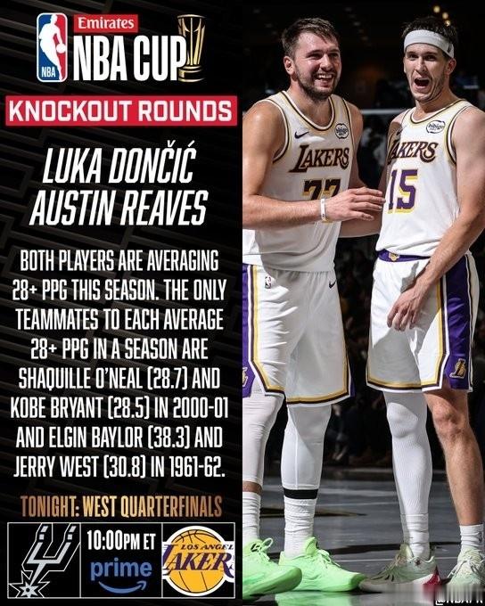 东契奇(场均35.0分)与里夫斯(场均28.4分),两人场均得分均超过28分。历史上单赛季场均同时达到28+分的队友组合仅有:2000-01赛季的奥尼尔(28.7分)与科比(28.5分),以及1961-62赛季的埃尔金·贝勒(38.3分)与杰里·韦斯特(30.8分)。湖人东契奇