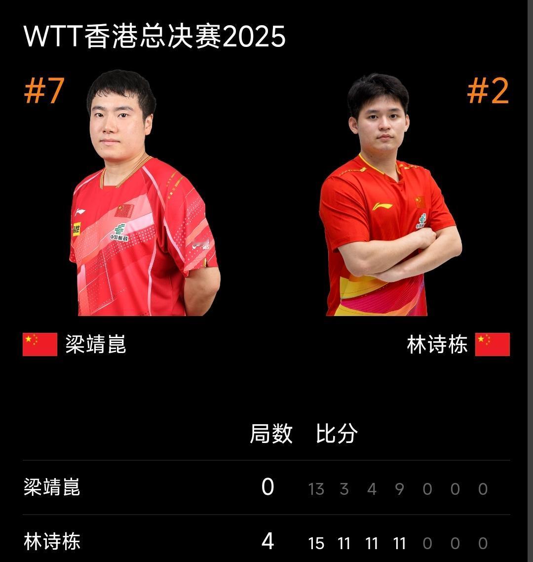 林诗栋4-0梁靖崑晋级八强! WTT香港总决赛2025 男单首轮比赛继续进行,刚结束的国乒内部德比战中,二号种子林诗栋以大比分4比0战胜梁靖崑晋级八强! 首局是双方争夺的焦点,林诗栋抓住机会15-13拿下,之后打得顺风顺水,再拿三局,战胜了梁靖崑晋级八强! 四分之一决赛,林诗栋对阵向鹏与安宰贤之间的胜者!