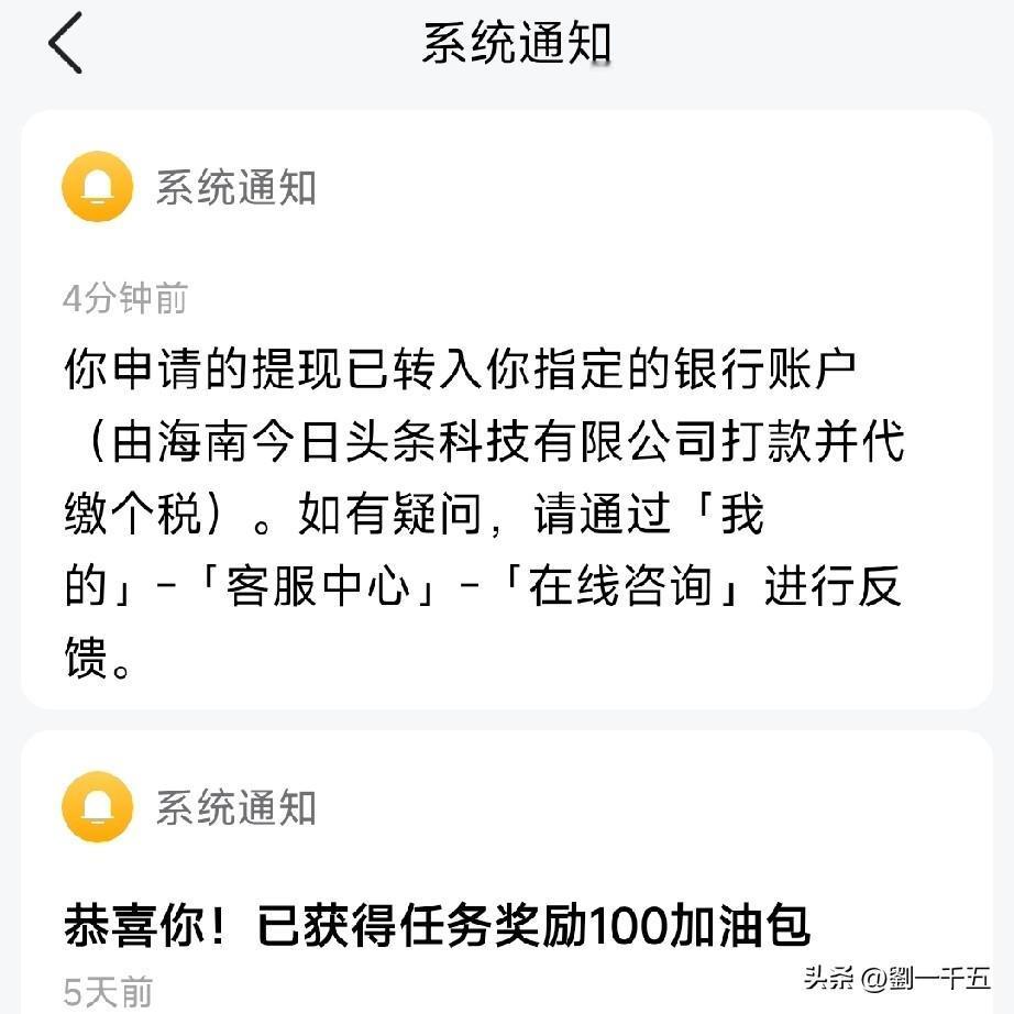 在头条上最爽的感觉就是,只有有点钱,星期四就能提。过去是要100元的,现在到一元也能提。 只要一点开收益,这面一点,那面就回通知,银行卡上马上报告到帐。 其他平台提收益如何,不知道,但是头条上抖音上倒是省心的,就是快而且准确。