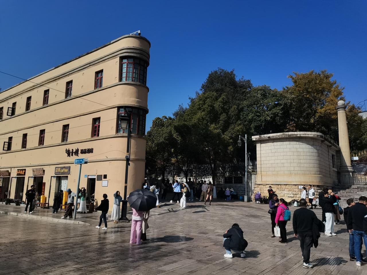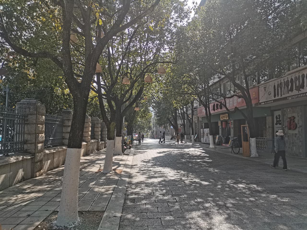 昆明老街的纸片楼确是网红打卡点,每天人潮汹涌,拍照留念者络绎不绝。 可大家却忽视了它后面的云瑞西路,这其实也是一条宝藏街道。 你只要踏上这条弧形老街的青石板路,那种民国时期特有的伤怀氛围与时光沉淀的怀旧味道就会立刻抓住你的视觉与心跳。 尤其是现在昆明秋冬季充满疏离感的树影与光影更把这种独特的氛围渲染到了极致。 走在这条路上,你甚至会有种不真实的错觉,仿佛自己一脚踏进了一部老电影的镜头一般。 云瑞西路上的那些咖啡小店也很会应景,把自己的店面打整得很有装饰性与镜头感,在这里拍点儿个性写真想必也会很出片。 云瑞西路,一条被昆明老街的烟火喧杂遮掩了的隐秘街道,它正等着你去发现它隐藏的魅力。