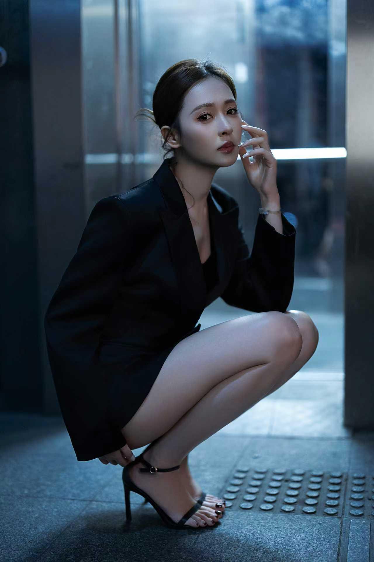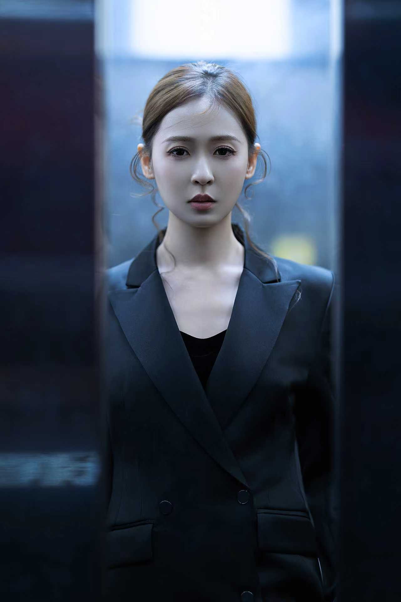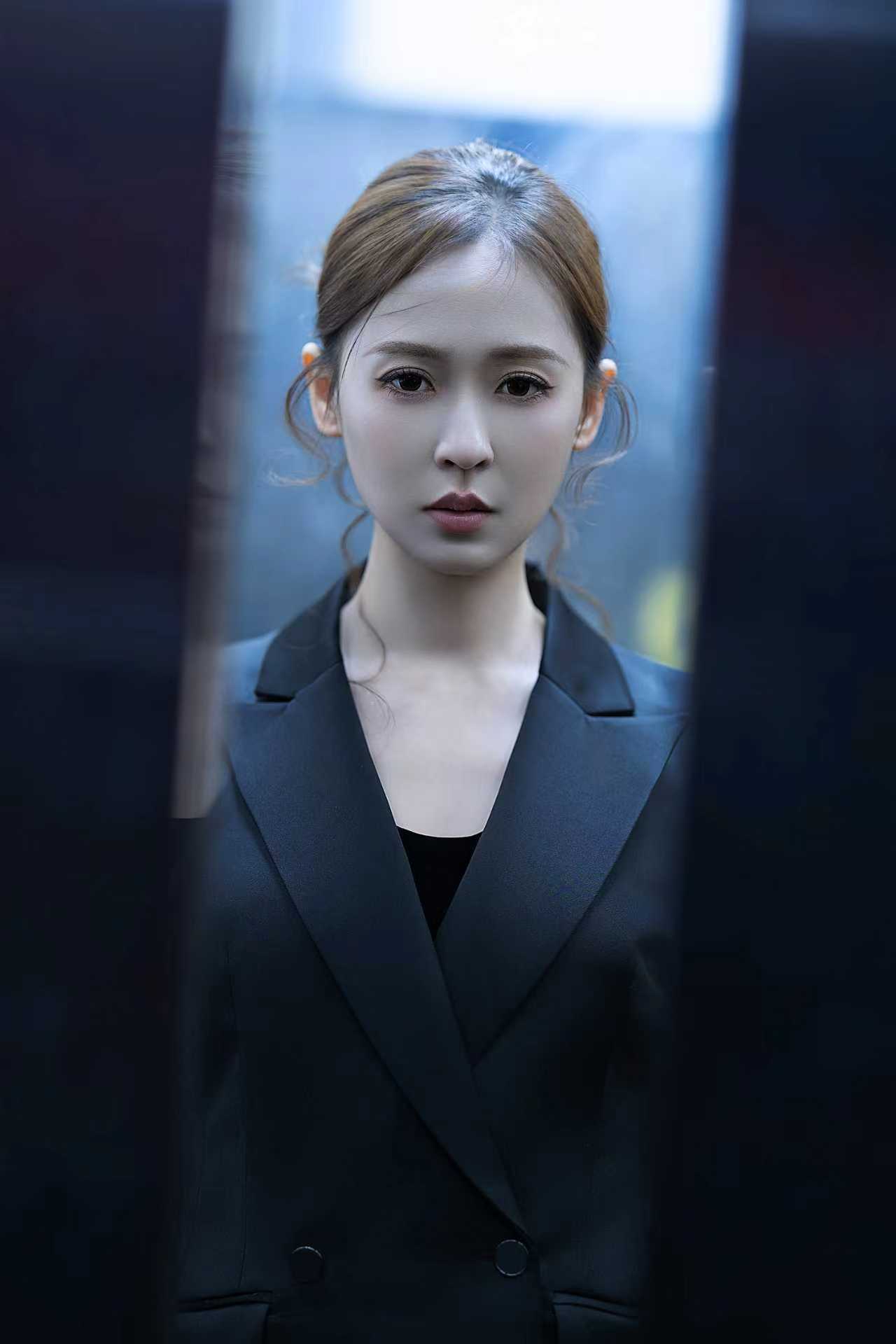 《灰色调里的光》深灰西装包裹着曲线像城市建筑的线条冷峻而精准浅蓝丝巾在颈