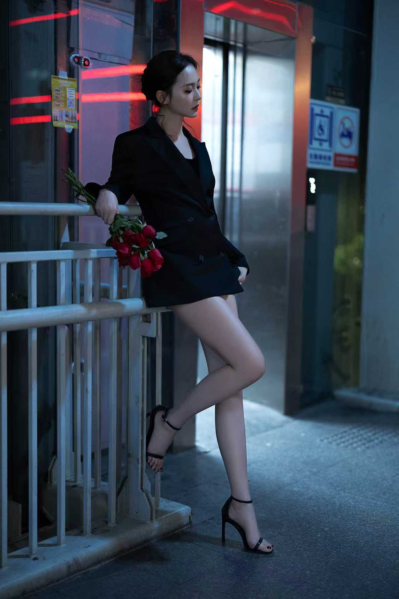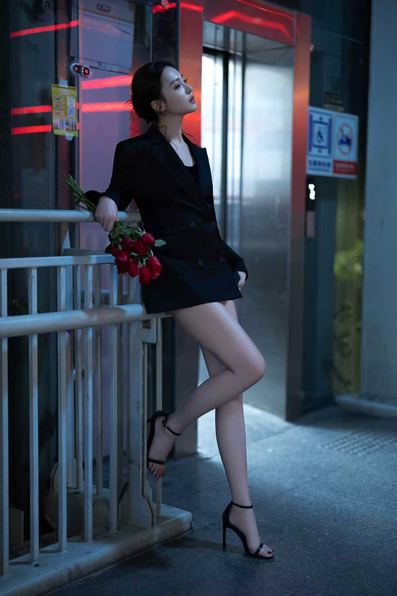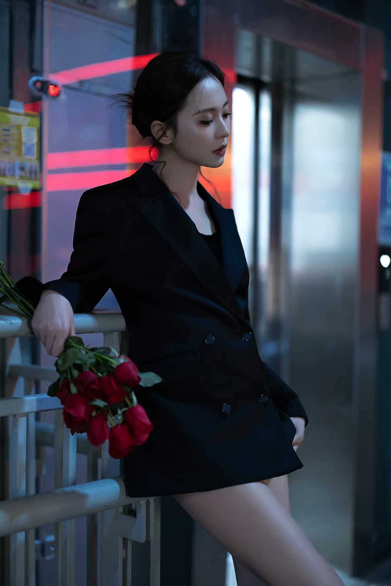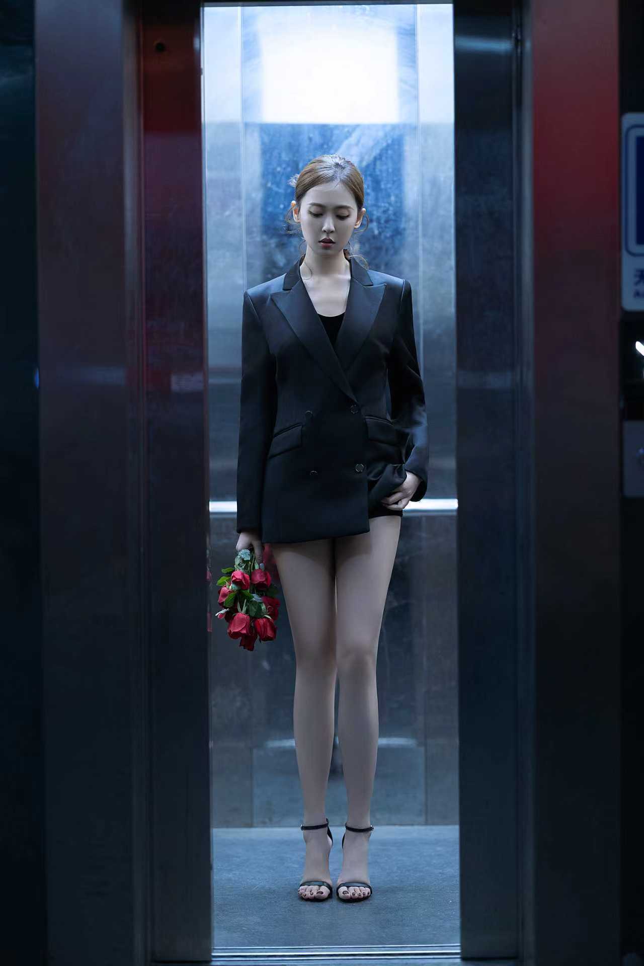 《灰色调里的光》深灰西装包裹着曲线像城市建筑的线条冷峻而精准浅蓝丝巾在颈