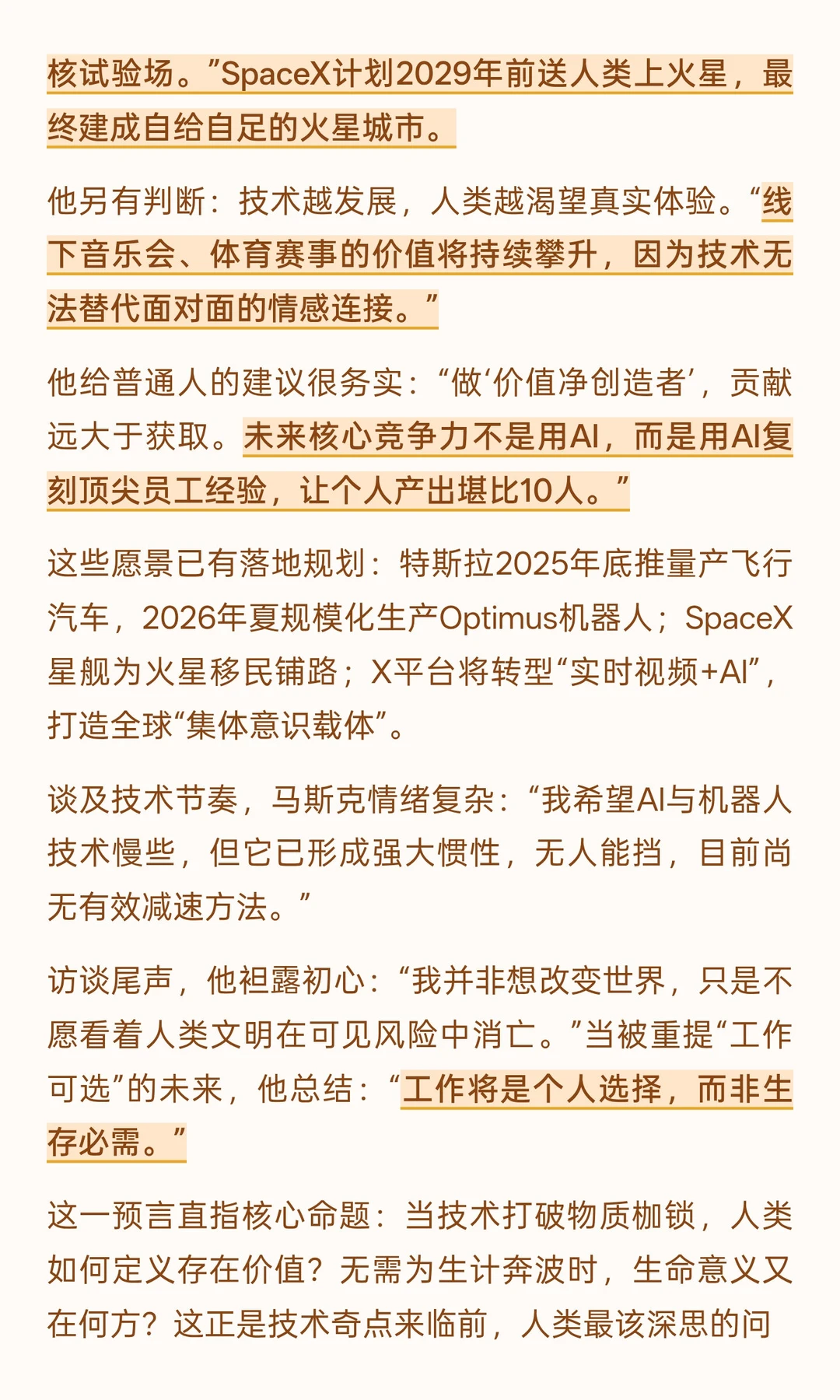 访谈视野不止于工作与经济。谈及火星探索,他否认“火星逃生舱”论:“那里不是富豪避难所,而是硬核试验场。”