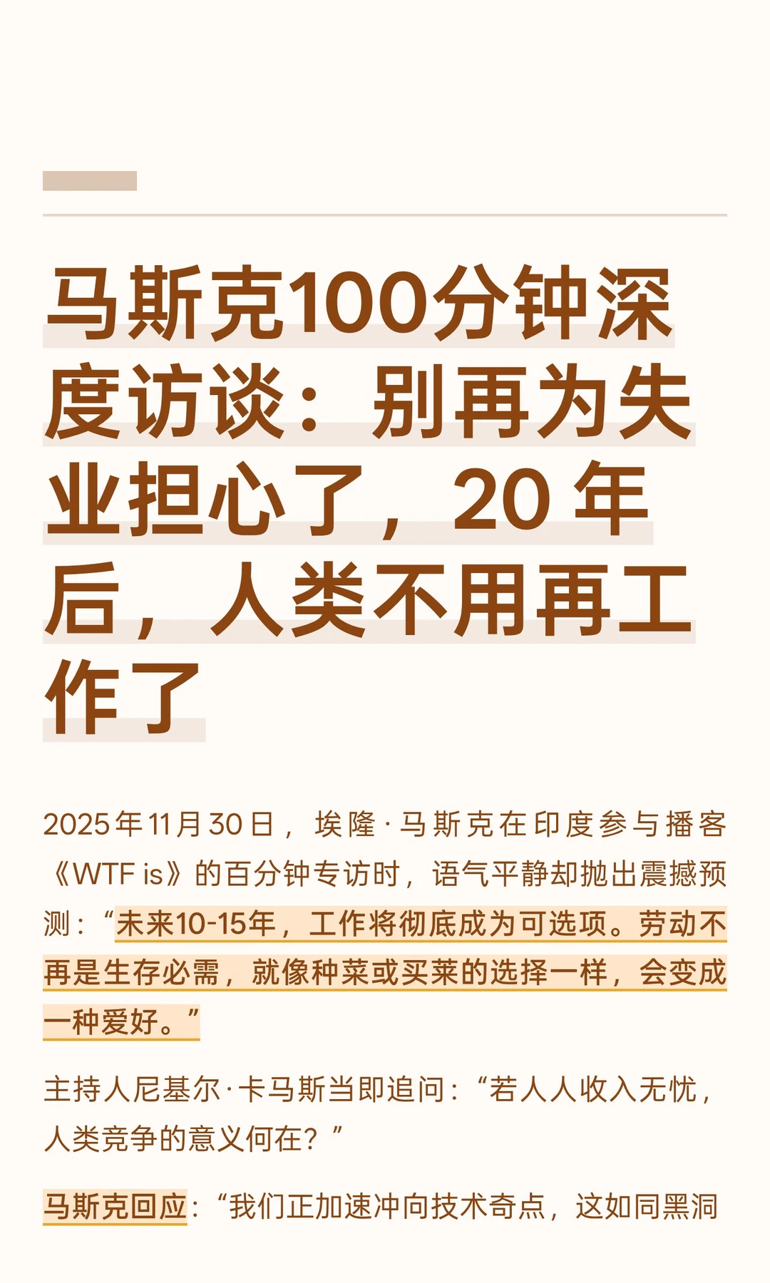 2025年11月30日,埃隆·马斯克在印度参与播客《WTF is》的百分钟专访时,语气平静却抛出震撼预测:“未来10-15年,工作将彻底成为可选项。劳动不再是生存必需,就像种菜或买莱的选择一样,会变成一种爱好。”