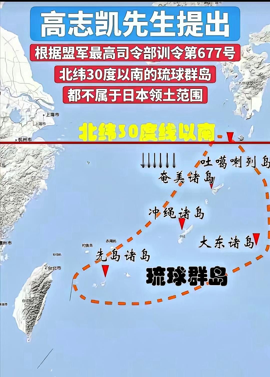 真厉害👍👍👍 高志凯教授把盟军最高司令部训令677号都扒出来了,并明确指出:北纬30度以南的琉球群岛,根本不属于日本领土的范围。 这份训令可不是随便的东西。是二战日本战败后,盟军定的日本领土规矩,相当于给日本的地盘划了硬边界。当年日本签字认了输,领土该归哪就得按国际上的说法来,677号训令写得清清楚楚,琉球不在日本该管的地方,这是实打实的历史事实。 好多人现在都被带偏了。觉得琉球跟日本这么多年,就该是日本的。这想法根本站不住脚。领土归谁,不是看占得久,得有合法依据。盟军这份训令就是最硬的依据,当年国际社会都认,日本自己也签了字,现在想装糊涂,门儿都没有。 高志凯教授扒出这份文件,就是要戳穿日本的小心思。这些年日本总在领土上搞小动作,一边偷偷加强对琉球的控制,一边想把历史真相搅浑,想把琉球彻底变成自己的地盘。这份训令一出来,日本那些说法直接就没了底气。 就说去年,日本还想着在琉球搞军事基地扩建,美其名曰“保障安全”,其实就是想进一步攥紧对琉球的控制权。可他们压根不提677号训令,故意回避琉球不属于自己的事实,说白了就是揣着明白装糊涂。 琉球的事,不只是日本和琉球的事。关系到国际秩序,也关系到历史公不公平。二战打出来的结果得被尊重,当年定的规矩不能随便改。日本要是懂规矩,就该正视这份训令,别再瞎琢磨扭曲事实。 现在不少人都不知道琉球的真实历史,连677号训令都没听过。高志凯教授把证据摆出来,就是想让更多人看清真相。历史不能忘,更不能被改,领土归属这种大事,每个人都该知道真实情况。 日本在领土问题上一直不安分,从钓鱼岛到琉球,总想多占点好处。可历史是公平的,再怎么耍手段,证据就摆在那,躲不掉也瞒不了。这份训令就是最好的证明,直接打破了日本的幻想。 琉球有自己的文化和历史,本来就该有明确的身份。被日本管了这么多年,当地不少人早就有意见了,诉求也没人当回事。现在677号训令被翻出来,不光是理清归属,也是给琉球的地位一个合理说法,对当地人来说,也算迟来的公道。 别再被日本的说法骗了,有677号训令这份铁证在,谁对谁错一眼就能看明白。日本想霸占琉球的心思,在真相面前根本站不住脚。 各位读者你们怎么看?欢迎在评论区讨论。