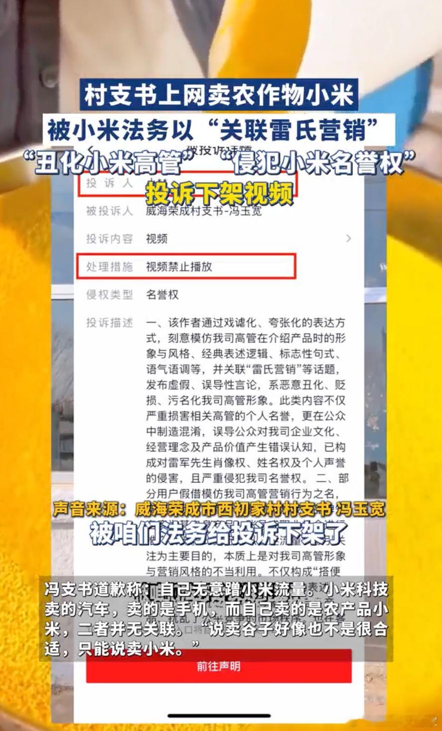 如果“小米”这么干,那“皮卡”也麻烦了~今天在群里看到一个“道歉视频”,说是「威海荣成市西初家村村支书」因为在网上带货本地农产品—小米,被小米公司投诉下架了,理由是“丑化小米高管”并侵害“小米名誉权”。因为卖小米的原始视频被删了,我没有看到原视频,我用最最最恶意来揣测这位村支书的原视频,最多也就是不仅卖小米,还模仿了雷老师的演讲。我想这也就算是到头了吧?不会再有更恶略的举动了吧?一个村支书卖小米,又不是网红吃流量,我相信底线还是有的。如果沾上“小米”就会被“投诉、侵权、删除”这样“一键三连”,那“皮卡”可就麻烦了~这俩挨得上么?“皮卡”能有啥麻烦?请各位继续往下看。各位可以去中国商标局的官网查询一下,查询一下“皮卡”的注册商标。自1985年申请,1986年公示并通过之后,在中国境内的“皮卡”商标就归属日产汽车了(日产自动车株式会社)。换句话说,如果日产也学小米“沾着封、碰着删”,那中国所有进口、合资、国产、老头乐、手攒的那种“一个乘员舱后面拉一个货斗”的车型就都不能叫“皮卡”了,全部都要改名。这里就不发散了,谨言慎行。我只想说咱不提什么格局,也不说别的,能不能把之前的开朗、自信、豁达再捡起来?are you Ok那时候的阳光与自信才是大家希望看到的,而不是一个看似威风八面并大杀四方的品牌形象。村支书卖小米被投诉下架小米小米皮卡日产汽车