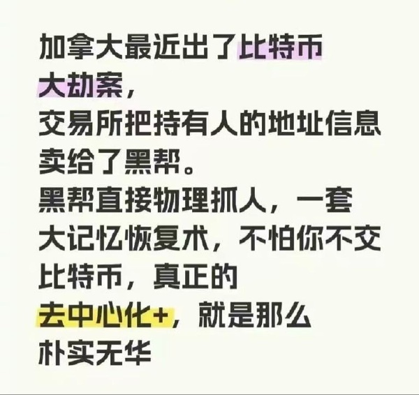 比特币的一大特点就是“交易成本低”,从这个案例来看,也确实不高,只需要非常简单的工具,比如,绳子,胶带,棍棒之类的,就可以完成大额交易。既没有跨行转账的手续费,也不需要额外购买装纸币的尼龙包,真的是非常方便