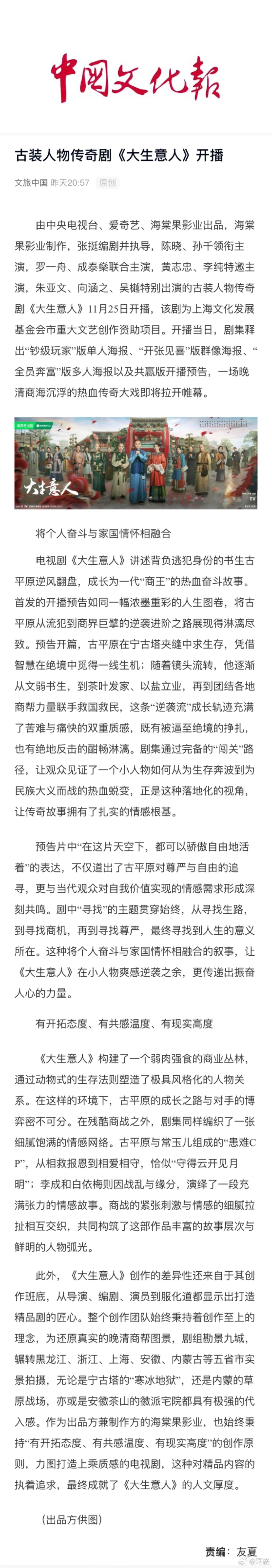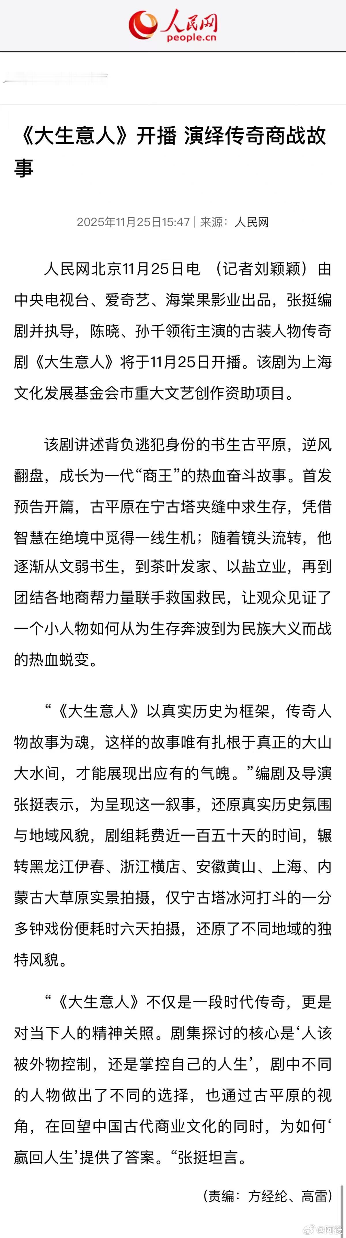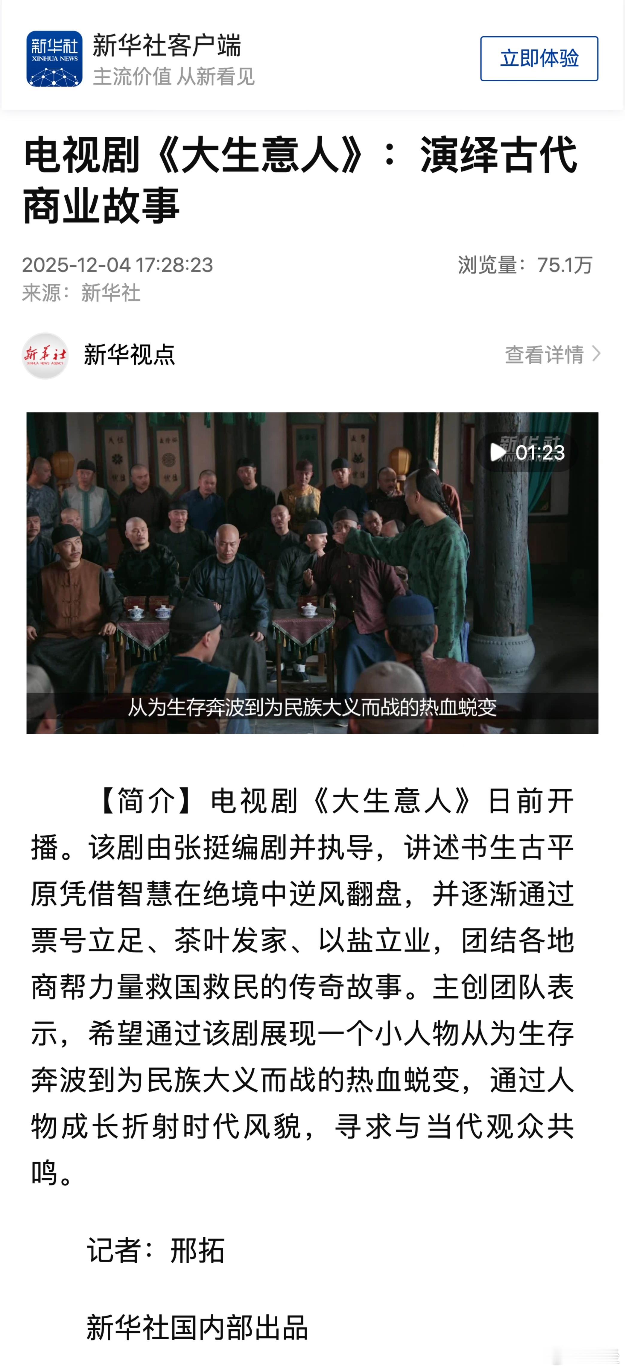 人民日报点赞大生意人大生意人本来对古装商战剧兴趣寥寥,直到刷到人民日报点赞《大生意人》才抱着试试的心态点开,结果直接真香!它不只是讲赚钱的门道,更是把民族商业的脊梁拍了出来,看得人心里又暖又燃!