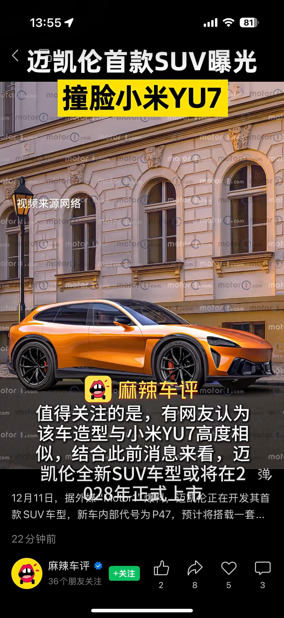 网传迈凯伦SUV撞脸小米YU7 有点难评 迈凯伦首款SUV
