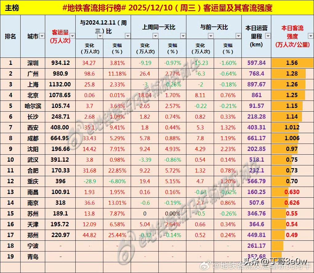 南昌地铁客流量在周三又是刚过100万人次[呲牙][呲牙][呲牙] 爆料 身边事 中国地铁客流日报 昨日客流 排行榜 周三 2025年12月10日 星期③ 全国重点城市轨道交通客流量排行榜: 上海:1132.00万 北京:1078.65万 广州:980.90万广州地铁 深圳:934.12万深圳地铁 成都:664.95万 西安:408.00万西安爆料 重庆:396.00万重庆身边事 武汉:391.12万武汉地铁 南京:318.00万 长沙:248.71万长沙身边事 郑州:220.97万郑州爆料 沈阳:196.66万 天津:195.72万天津地铁 苏州:189.10万苏州身边事 合肥:170.33万合肥爆料 青岛:100万+ 宁波:100万+宁波地铁 哈尔滨105.74万哈尔滨爆料 南昌:100.91万