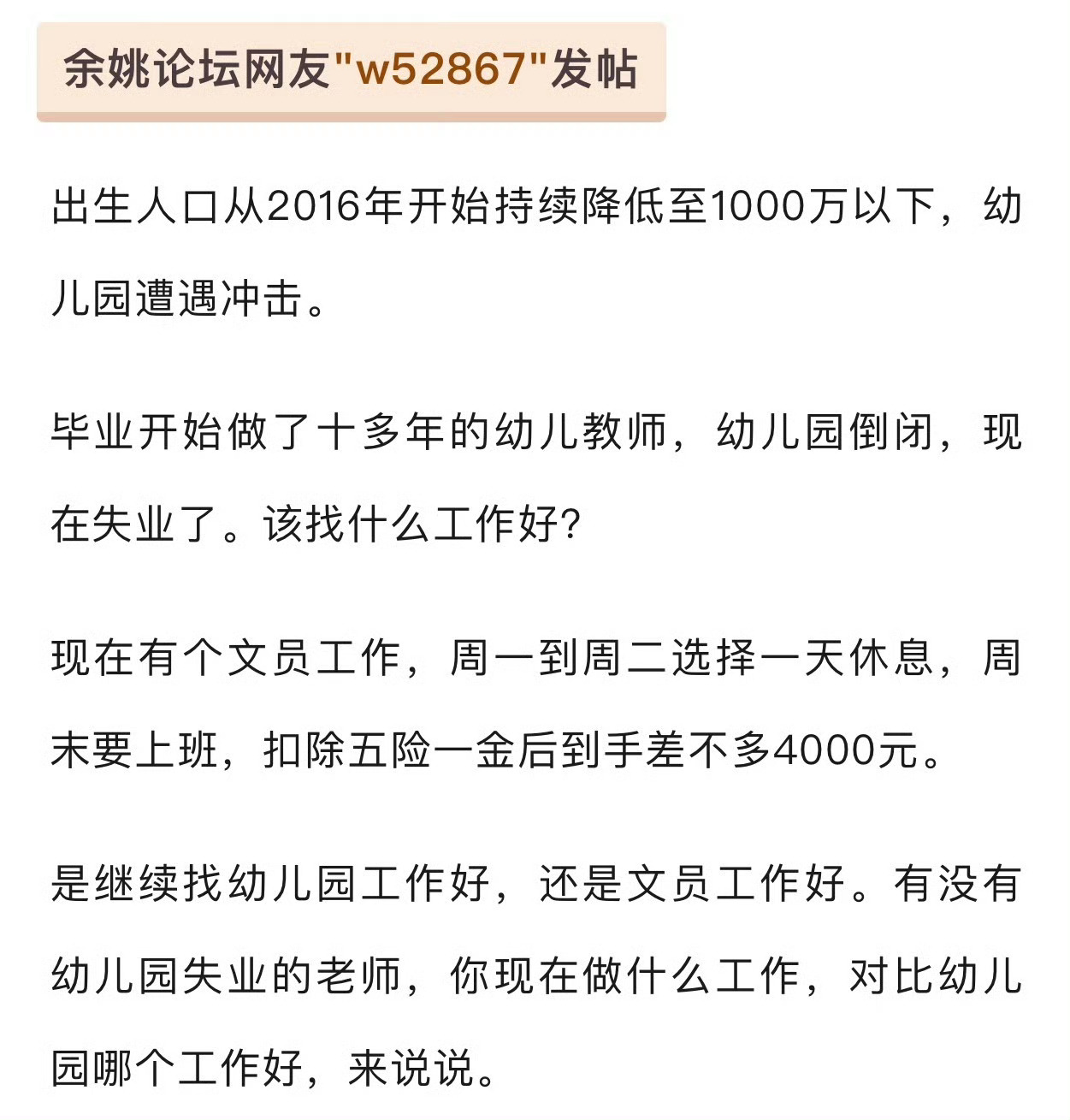 余姚求助幼师失业找什么工作好 ?余姚网友:幼儿园倒闭失业,找什么工作好?余姚论坛网友"w52867"发帖:出生人口从2016年开始持续降低至1000万以下,幼儿园遭遇冲击。毕业开始做了十多年的幼儿教师,幼儿园倒闭,现在失业了。该找什么工作好?现在有个文员工作,周一到周二选择一天休息,周末要上班,扣除五险一金后到手差不多4000元。是继续找幼儿园工作好,还是文员工作好。有没有幼儿园失业的老师,你现在做什么工作,对比幼儿园哪个工作好?来源:余姚明生活同城热点创作计划