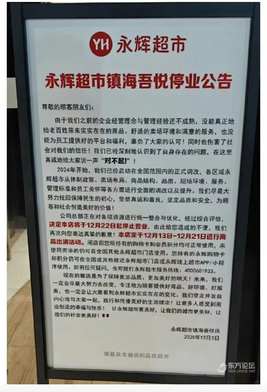 宁波这家超市22日起停业 ,购物卡还没用完的朋友们注意了!宁波又有一家超市要关门了!!!日前,东论一网友发帖称在网上看到消息镇海吾悦广场的永辉超市要关门了!据永辉超市官方发布的停业公告显示,镇海吾悦广场店将于12月22日起正式停止营业。12月13日——12月21日开始商品出清。没用完的购物卡可在其他门店使用。那以后宁波的永辉超市就只剩下2家了,分别是:永辉奉化万达店、永辉世纪金源店。来源:东方热线同城热点创作计划