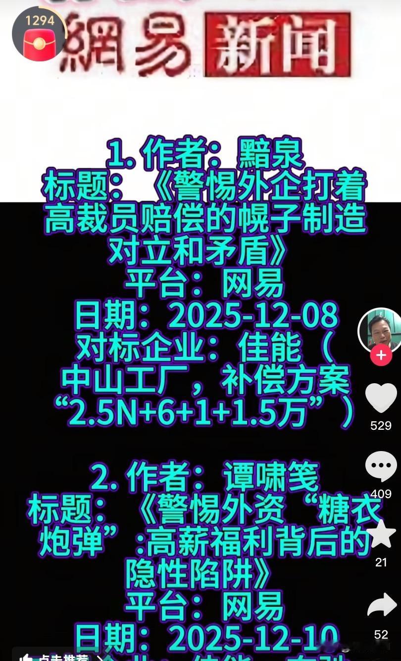 针对外企的高额赔偿,网易发文疾呼:警惕外国资本家的糖衣炮弹!谁料评论区一语破防,网友直言:我们虽穷但不傻,好坏分得清。 实在费解,这些动辄高举爱国大旗的人,究竟怀揣着怎样的心思。外企本就没做什么出格的事,不过是凭着良心,给曾为其效力的员工一份应有的回报。这种彰显企业诚信与人文关怀的举动,怎么到了他们的嘴里就变味走样了呢?他们为什么看到本国百姓可以多拿到一些补偿,内心就这般浑身不自在了呢? 试问,一个连自己同胞都吝于善待的人,又怎能真心热爱自己的祖国?