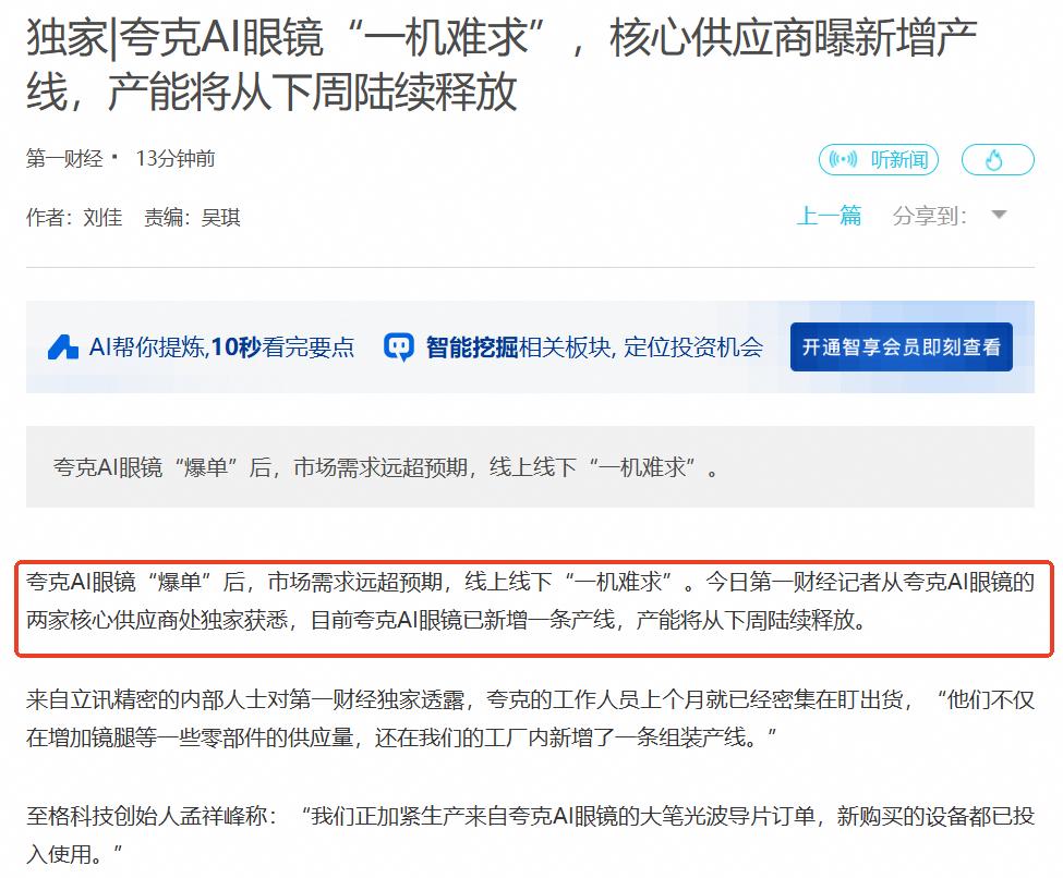 这两天,有这么几件事值得关注,把它们连起来就映射了中国科技未来几年的走向。[灵光一闪] 首先是夸克AI眼镜才发售半个多月就已经全渠道卖空,不只线上“秒没”,线下体验店从早排到晚,有用户为了试戴在商场排了几个小时。更离谱的是,二手平台直接涨到四五千,依然有人抢。 就在全网哀嚎抢不到的时候,核心供应链直接霸气回应,正在新增产线,下周起释放产能。 过去十五年,中国在智能手机时代完成了从追赶到领先。而夸克AI眼镜的爆发,意味着一个关键趋势,中国科技正在从手机时代走向AI眼镜时代。 为什么这么说?因为 AI 的入口正在从“手”变成“眼 + 耳”,而夸克AI眼镜是第一个真正做到“随时可用、实时可感”的国民级设备。 靠着搭载的千问能力,夸克AI眼镜能直接把眼前的世界变成另一种模样,实时字幕、跨语言翻译、AI总结、AI视觉理解,每一个功能都像专为普通人设计,不用再掏出手机就能完成支付、导航、买东西和订票。 最关键的是,功能成熟、体验稳定、价格能打之外,还有中国供应链的生产速度也相当给力,夸克AI眼镜从售罄到回应扩产只隔了一天时间,这个速度全世界可能也就中国做得到。 当国外品牌还在做概念机、展示 demo,中国已经做出能卖、能用、还能快速扩产的真产品,这不仅是夸克AI眼镜的胜利,更是中国科技体系的一次集体亮相。 我们已经能把AI带进生活,未来它将会成为和手机一样的日常。
