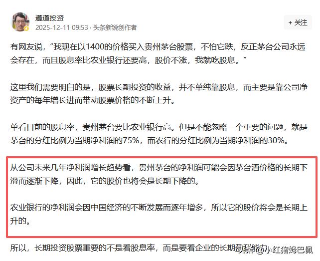 最近又发现一个很不负责任的账号,而且每天产出很多垃圾内容,通过“吹银行”安抚了买入银行被套者的心,获得了不少粉丝。 例如这条,永远预设了银行是好的,别的行业和公司是不好的,所有的判断都基于自己拍脑袋。那为什么不是农业银行没有护城河面临同业化竞争,而茅台具有独一无二的品牌优势,所以茅台利润有保障而农行没有;为什么不是中国经济终将复苏、CPI转正带动餐饮和白酒消费,茅台利润向上、而资本市场活跃金融逐步脱媒银行业下滑;为什么不是茅台可以进一步提高分红比率,而农行资本充足率不足提高不了分红比率?(注:以上仅为举例,告诉大家拍脑袋的话可以随便说,并不完全代表实际) 我依然是这句话,基于商业模式和当下估值,茅台投资价值远高于农行。 记住,我不是银行黑,我也没有说银行不好,我认为银行中性,或者说“没有那么好”,而那些不学无术骗流量的,嘴里的银行都是“非常非常好”。 综合评定:该账号金融内容不靠谱等级,四颗星!