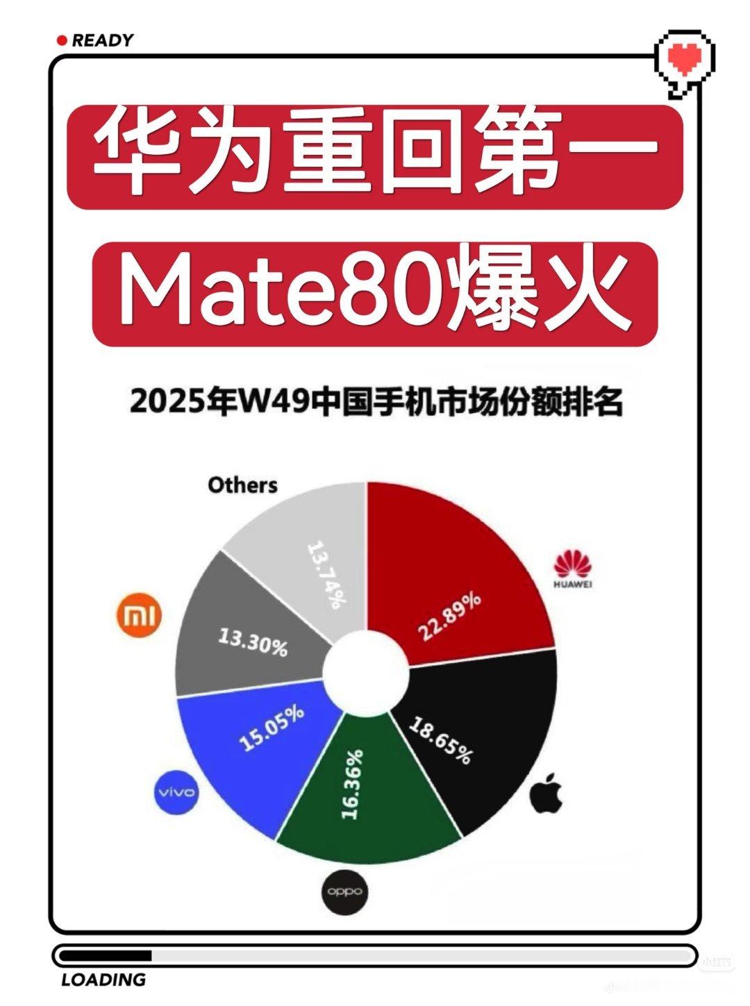 华为Mate80销量华为Mate 80系列首周销量达37.66万台,推动华为手机市场份额连续两周超越苹果,重登中国市场榜首! 华为Mate80标准版加量不加价,Mate80 Pro Max溢价没货!