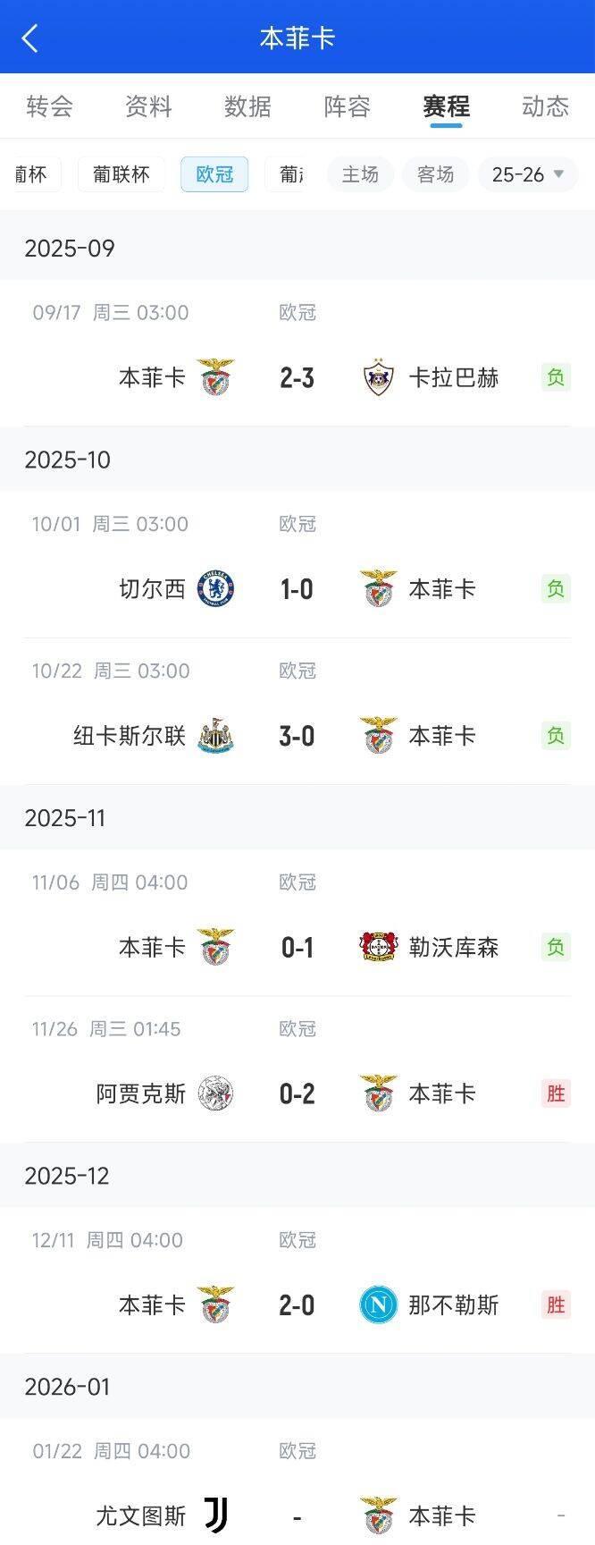 魔鬼赛程、晋级希望 欧冠联赛第六轮,穆帅带领的本菲卡坐镇主场2-0战胜意甲排名第二的那不勒斯,收获欧冠两连胜,排名升至第25,距离附加赛只有一步之遥! 遥想抽签出炉之后,本菲卡的欧冠之旅堪称地狱副本,除了首战阿塞拜疆的卡拉巴赫之外,其余对手均是各大联赛的豪门球队,偏偏本菲卡自己也不争气,首战主场2-3被卡拉巴赫让二追三逆转,丢掉了最不应该输球的一场,随后客场0-1不敌切尔西、0-3完败纽卡斯尔、主场0-1不敌勒沃库森,在第五轮客场2-0击败阿贾克斯收获首胜,本场战胜那不勒斯后本菲卡已经摸到了附加赛的门槛! 不过,最后两场比赛本菲卡仍然凶多吉少,客场面对尤文图斯、主场迎战近况不佳的皇家马德里,穆帅如果想率领本菲卡杀进附加赛,两场比赛最少要拿四分才能把希望握在自己手里,加油啊、穆帅!