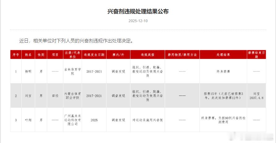 中国田径东京奥运选手四年前神秘消失 真相比想象的残酷 所在队已集体禁赛彻底无缘全国赛场 奥运冠军被迫转会中国反兴奋剂中心12月10日发布重磅公开信息,内蒙古著名田径教练刘宝,2017年到2021年期间,因为组织、引诱、欺骗和教唆运动员使用兴奋剂,被禁赛15年。因为此前被禁赛3年,现在是又追加了12年,一直到2037年4月才禁赛期满。按照这则信息透露出的消息,刘宝犯事到2021年止,在2022年已开始禁赛。但反兴奋剂中心在2021年和2022年的全年公开处罚信息里并没有刘宝。这次选择了大白于天下。如此一来,对于笔者这种圈外田径迷而言颇为困扰的选手神秘消失事件,也就迎刃而解。内蒙古女子马拉松队,在刘宝带领下,17年全运会拿下女子团体冠军,2020年全国马拉松锦标赛拿下团体亚军。2020年的西安马拉松,金铭铭、史立莹、宫丽华包揽前三。史立莹和金铭铭在21年的东京奥运马拉松国内选拔赛上名列第四和第五,史立莹达标成功,成为出征东京奥运会的中国女子马拉松第四人,也就是替补选手。虽然实际没有出战,但可以被认为是中国奥运军团一员。但怪就怪在,打那之后,内蒙古这些战功显赫的选手们,就不再有比赛记录了,岁数不大的她们就此人间蒸发。也没有公开新闻或资讯报道过她们的行踪。现在回看,真相大白,肯定是禁药被查,选手和教练被集体禁赛。至于是现场被查;突击检查时被查;还是有人事后举报揭发,有关部门顺藤摸瓜破的案等等,其实已经不很重要了。世界田联官方网站留下了她们最后的数据。以史立莹和金铭铭为例,从2019年衡水马拉松开始,到2021年的徐州马拉松(也就是东京奥运选拔赛),史立莹的成绩显示全部为DQ,即犯规取消资格。金铭铭更惊人了,从2017年开始到徐州马拉松,五个赛季的成绩全部DQ。从19年8月的世锦赛选拔赛女子一万米开始,到徐州马拉松截止,全DQ。其实也没什么奇怪的,从以往对刘宝的采访中可以知道,金铭铭是跟随刘宝时间最长的主力选手。这次东窗事发,当时是导致内蒙古中长跑队全体禁赛。但现在回看,后续肯定是内蒙古整个田径队全体禁赛,个人中立都不行。否则刘宝怎么又追加了12年?必然是篓子越捅越大。今年全运会就是明证。我们看到:因为马拉松选手扎西次仁禁药被查这个大事件,所以西藏田径队都是以个人身份出战全运。但内蒙古田径队呢?除了已经转到其他队伍的选手,比如转到北京队的奥运冠军杨家玉之外,内蒙古队自备选手为零,毫无踪迹,连个人身份出场都没有。内蒙古田径队处在最彻底的禁赛期间。或许归属残障人士和U字头少年组的全国田径赛事例外?这个就不细查了。刘宝充其量就是中国田径的一位资深教练,同在反兴奋剂中心处罚决定名单里的吉林体育学院杨明,以同样的违规类型被处以终身禁赛。而杨明的名气,比刘宝可高了太多,就不在本文里叙述了。田径兴奋剂马拉松
