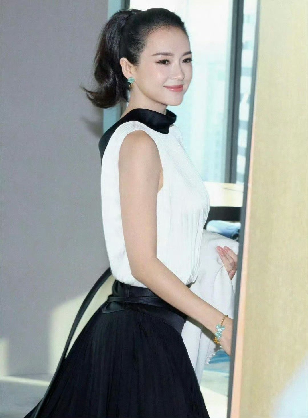 章子怡高马尾造型被章子怡新造型狠狠戳中!简约白褶无袖配黑裙利落大气,舒展姿态满是从容质感,细节里全是优雅气场,颜值与气质双在线,太绝了👏