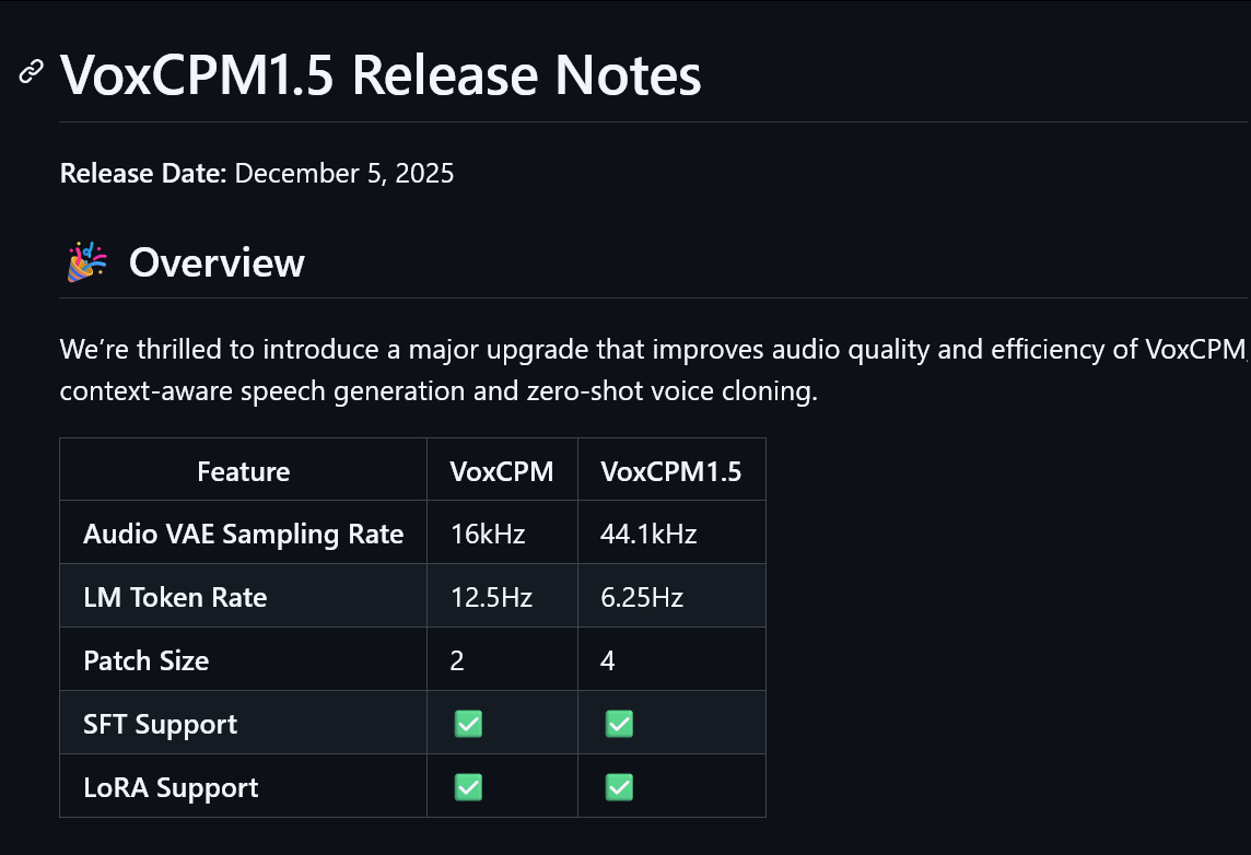 面壁小钢炮的语音合成/语音克隆模型 VoxCPM发了个新版本: VoxCPM1.5模型地址: huggingface.co/openbmb/VoxCPM1.5这个版本是一次比较大的升级,音质和稳定性都有提升,支持44.1kHz 采样,支持全量微调和LoRA微调