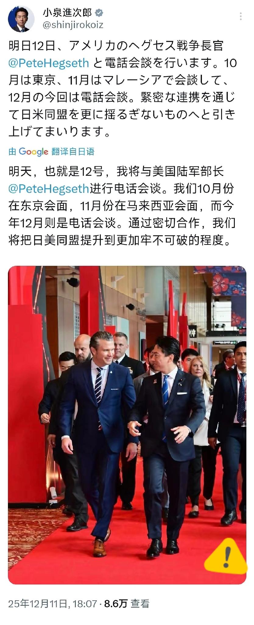 日本防卫大臣小泉进次郎今晚(12月11日晚)发文写道:“明天,也就是12号,我将与美国战争部长赫格塞斯进行电话会谈。我们10月份在东京会面,11月份在马来西亚会面,而今年12月则是电话会谈。通过密切合作,我们将把日美同盟提升到更加牢不可破的程度。” 这话听着挺好听,其实全是算计。三个月见三次面,从东京到吉隆坡再打电话,小泉这么急着秀关系好,就是刚吃了亏想找靠山。前几天12月6号,中日战机在宫古海峡以东对上了,歼-15两次用火控雷达照日本F-15,日方最后只能灰溜溜跑了,脸都丢尽了。 军事上输得惨,说话也没人听。小泉凌晨两点开记者会倒打一耙,结果被中国国防部拿证据怼回去,抗议根本没人理。没辙的日本只能赶紧抱美国大腿,可这份热乎劲,美方根本不稀罕。 赫格塞斯早就泼过日本冷水。12月6号他在加州演讲,压根没说要帮日本,反而像训小弟似的警告,说盟国要是在防务上偷懒就得付出代价。这话就是说给日本听的,所谓的密切合作,就是日本一头热。 更有意思的是,赫格塞斯还明说,美国不想遏制中国,也不会为了别人改台海局势,只在乎自己的好处。小泉嘴里牢不可破的同盟,连句表面支持的话都换不来,太讽刺了。 日本这么上赶着贴美国,就是想借同盟名义搞军队扩张。2025年日本防卫预算涨到11万亿日元,差不多700亿美元,提前两年达到GDP占比2%的目标,早就不是只守不攻了。 这笔钱大多花在能打的武器上。要造护卫舰、潜艇,还要买新导弹,甚至想从美国买“战斧”巡航导弹。借着跟美国合作的由头,日本一步步突破战后的军事限制。 就说去年9月的“坚毅之龙”军演,日本派了1.4万自卫队,美国来了5000士兵,看着阵仗大,其实就是互相利用。美国想靠日本盯着亚太,日本想靠美国撑腰扩军。 可日本的算盘再精,也藏不住没人待见的事实。亚洲已经有七个国家反对它的激进做法,俄罗斯在北方四岛加建导弹,韩国骂它瞎折腾,马来西亚因为日本政客拜战犯墓,全民都在抗议。 日本国内也骂声一片。为了凑防卫预算,政府要加个税和企业税,老百姓本来就被物价涨得难受,现在还要为扩军掏钱。东京街头万人游行反战,冲绳八万人联名要减美军基地,相关政客的支持率跌得厉害。 美国从来不会为日本冒险。之前钓鱼岛对峙,还有菲律宾仁爱礁的事,美军也就嘴上说说,真到关键时候跑得比谁都快。日本以为抱上了大腿,其实就是美国棋盘上随时能扔的棋子。 各位读者你们怎么看?欢迎在评论区讨论。