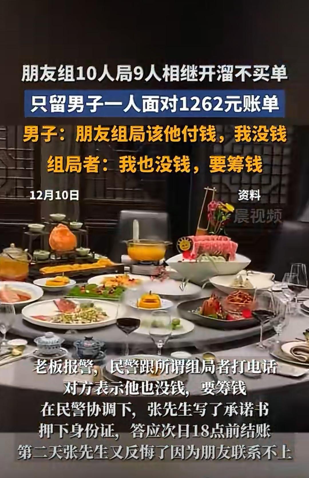 奇葩之事年年有!近日,重庆九龙坡一餐馆遭遇 “神奇买单”,10 人聚餐消费1262元,散席后只剩一张姓男子,结果该男子还没钱买单,最终在警方的协调下,该男子写下第二天还钱的保证书。然而,第二天该张姓男子又反悔了,导致餐馆的餐费无着落。10个人连1262元的餐费都付不起,简直太意外了,既然没有钱为什么还要组局呢?可能是都想占便宜白吃!
