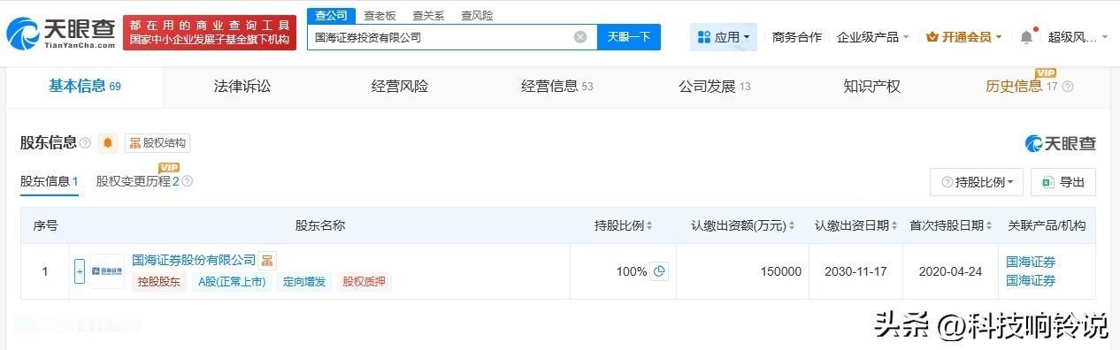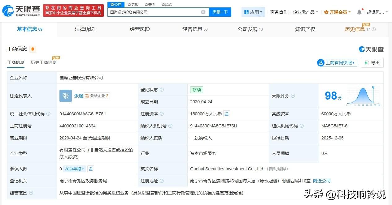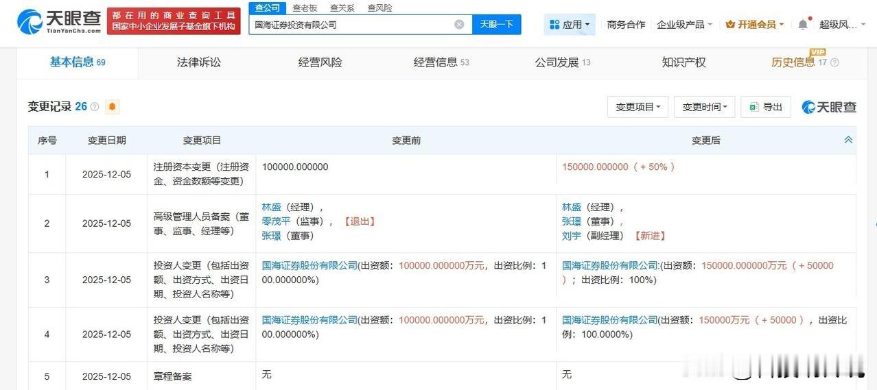 【国海证券投资公司增资至15亿 增幅50%】 天眼查工商信息显示,近日,国海证券投资有限公司发生工商变更,注册资本由10亿人民币增至15亿人民币,增幅50%,同时部分高管发生变更。 该公司成立于2020年4月,法定代表人为张璟,经营范围包括从事中国证监会批准的另类投资业务。股东信息显示,该公司由国海证券全资持股。 天眼查信息:
