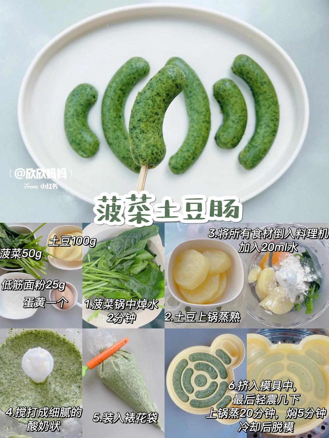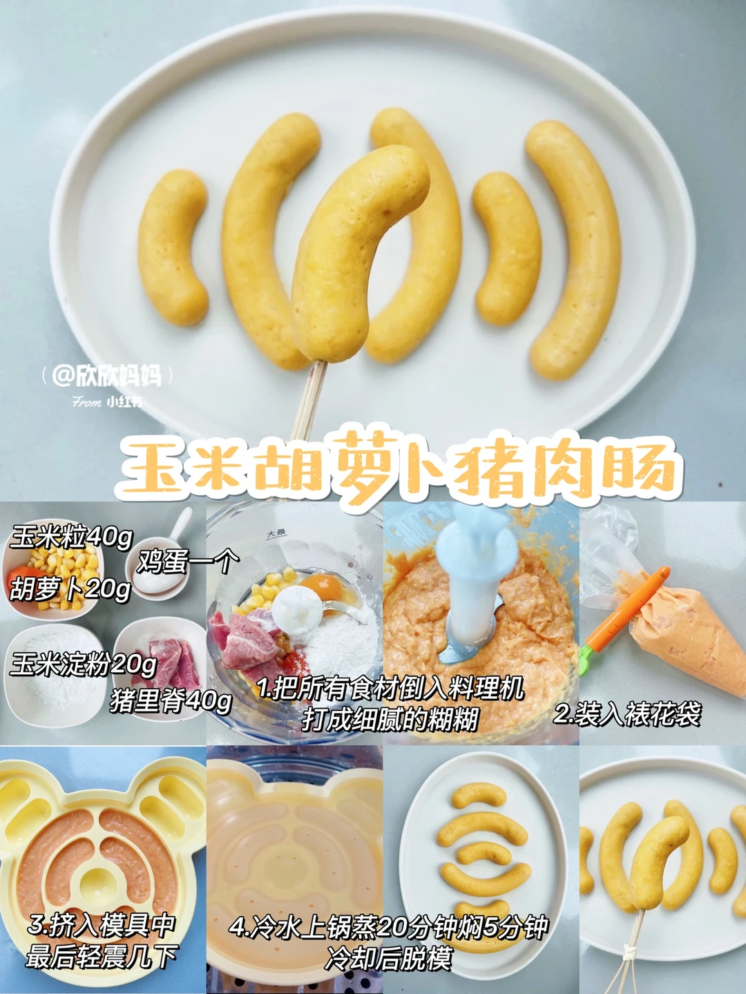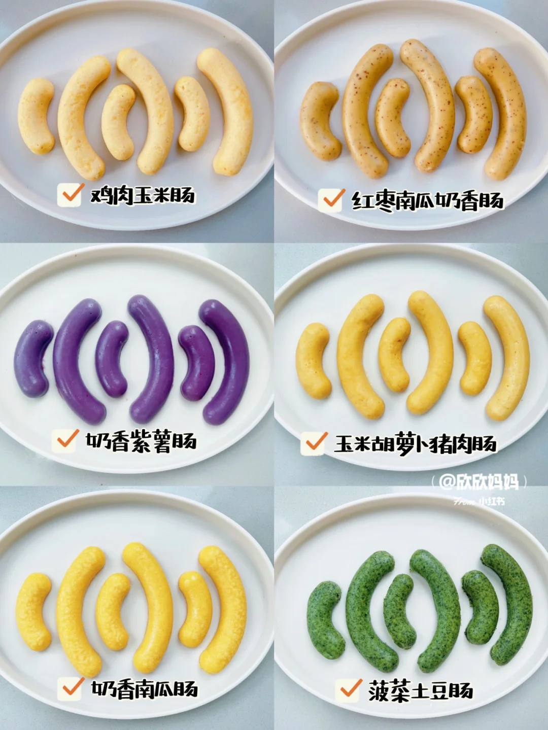 开始吃辅食之后的一两个月就可以慢慢添加手指食物啦!今天整理6款好吃又营养的辅食香肠,可以锻炼宝宝的抓握能力和咀嚼能力哦。 - 🌽鸡肉玉米肠 ✅食材:玉米粒30g、胡萝卜20g、鸡胸肉70g、玉米淀粉10g、鸡蛋一个 1️⃣:玉米粒和胡萝卜锅中焯水 2️⃣:鸡肉和鸡蛋倒入料理机搅打成肉泥 3️⃣:再加入胡萝卜、玉米粒和淀粉搅打细腻,装入裱花袋, 4️⃣:挤入刷好油(辅食油)的模具里,最后轻震几下,冷水上锅蒸20分钟焖5分钟冷却后脱模 - 🎃红枣南瓜奶香肠 ✅食材:红枣3颗、南瓜50g、低筋面粉50g、配方奶80ml 1️⃣:南瓜上锅蒸熟 红枣去籽切块 2️⃣:所有食材倒入料理机搅打成浓稠酸奶状 3️⃣:装入裱花袋,挤入刷好油(辅食油)的模具里,最后轻震几下,冷水上锅蒸20分钟焖5分钟冷却后脱模 - 🥔菠菜土豆肠 ✅食材:土豆100g、菠菜50g、低筋面粉25g、蛋黄一个 1️⃣:土豆上锅蒸熟、菠菜锅中焯水2分钟 2️⃣:所有食材倒入料理机加入20ml水,搅打成细腻的酸奶状 3️⃣:装入裱花袋,挤入刷好油(辅食油)的模具里,最后轻震几下,冷水上锅蒸20分钟焖5分钟冷却后脱模 - 奶香紫薯肠 ✅食材:紫薯60g、配方奶50ml、低筋面粉30g 1️⃣:紫薯上锅蒸熟 2️⃣:所有食材倒入料理机搅打细腻 3️⃣:装入裱花袋,挤入刷好油(辅食油)的模具里,最后轻震几下,冷水上锅蒸20分钟焖5分钟冷却后脱模 - 🎃奶香南瓜肠 ✅食材:胚芽米90g、南瓜30g、配方奶75ml 1️⃣:胚芽米提早浸泡3小时以上,南瓜上锅蒸熟 2️⃣:所有食材倒入料理机搅打成酸奶状并且有大气泡的糊糊 3️⃣:装入裱花袋,挤入刷好油的模具里,最后轻震几下,冷水上锅蒸20分钟焖5分钟冷却后脱模 - 🌽玉米胡萝卜猪肉肠 ✅食材:玉米粒40g、胡萝卜20g、鸡蛋一个、玉米淀粉20g、猪里脊40g 1️⃣:猪里脊用姜片柠檬片腌制15分钟去腥 2️⃣:所有食材倒入料理机搅打成细腻的糊糊 3️⃣:装入裱花袋,挤入刷好油的模具里,最后轻震几下,冷水上锅蒸20分钟焖5分钟冷却后脱模 辅食模具:ikv ⚠️八月龄是宝宝锻炼手指的最佳食物,多给宝宝做些手指食物锻炼抓握能力,自主进食慢慢就可以学会啦 宝宝手指食物|宝宝辅食香肠|