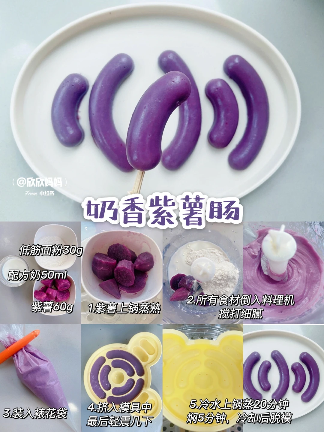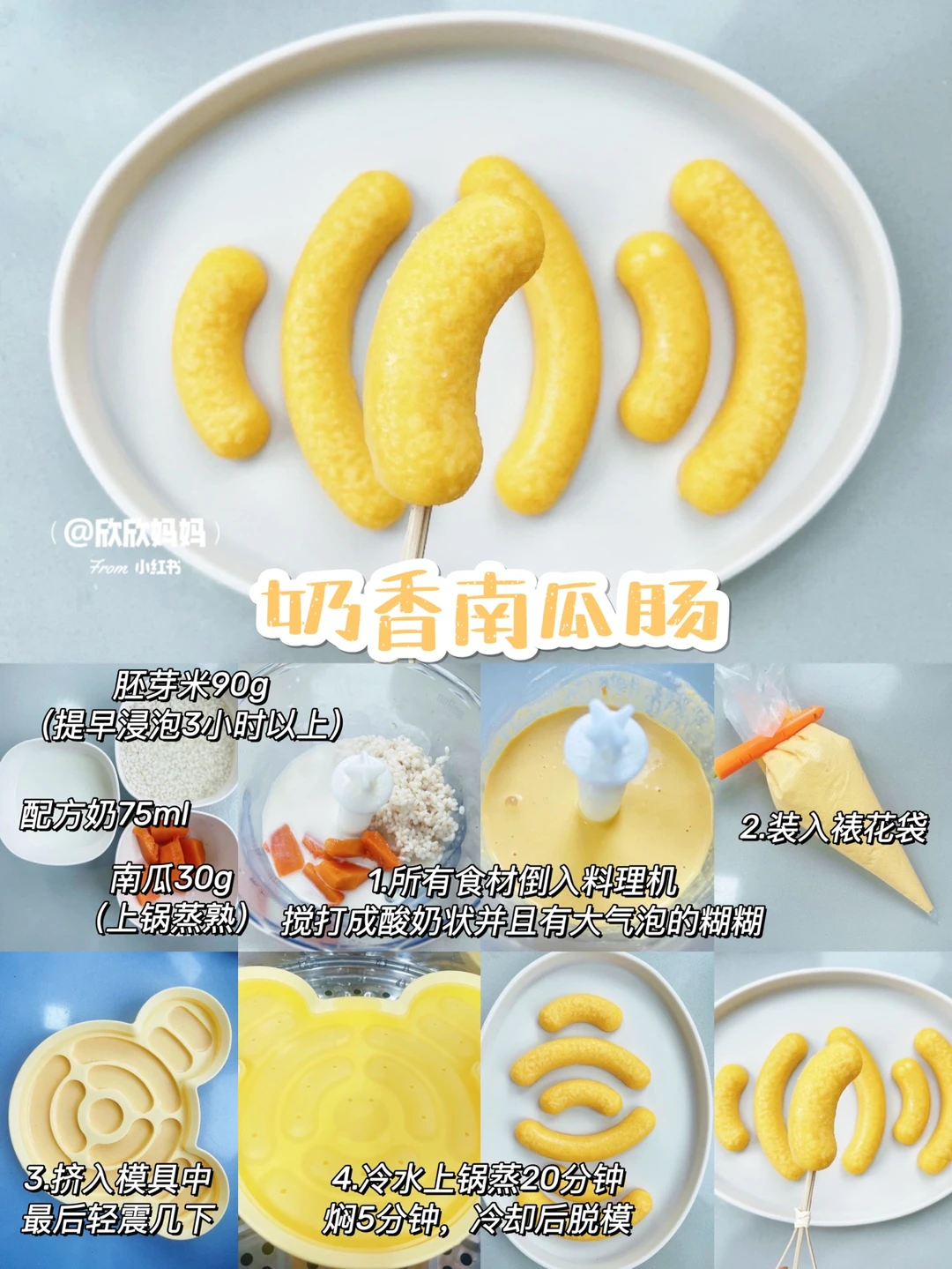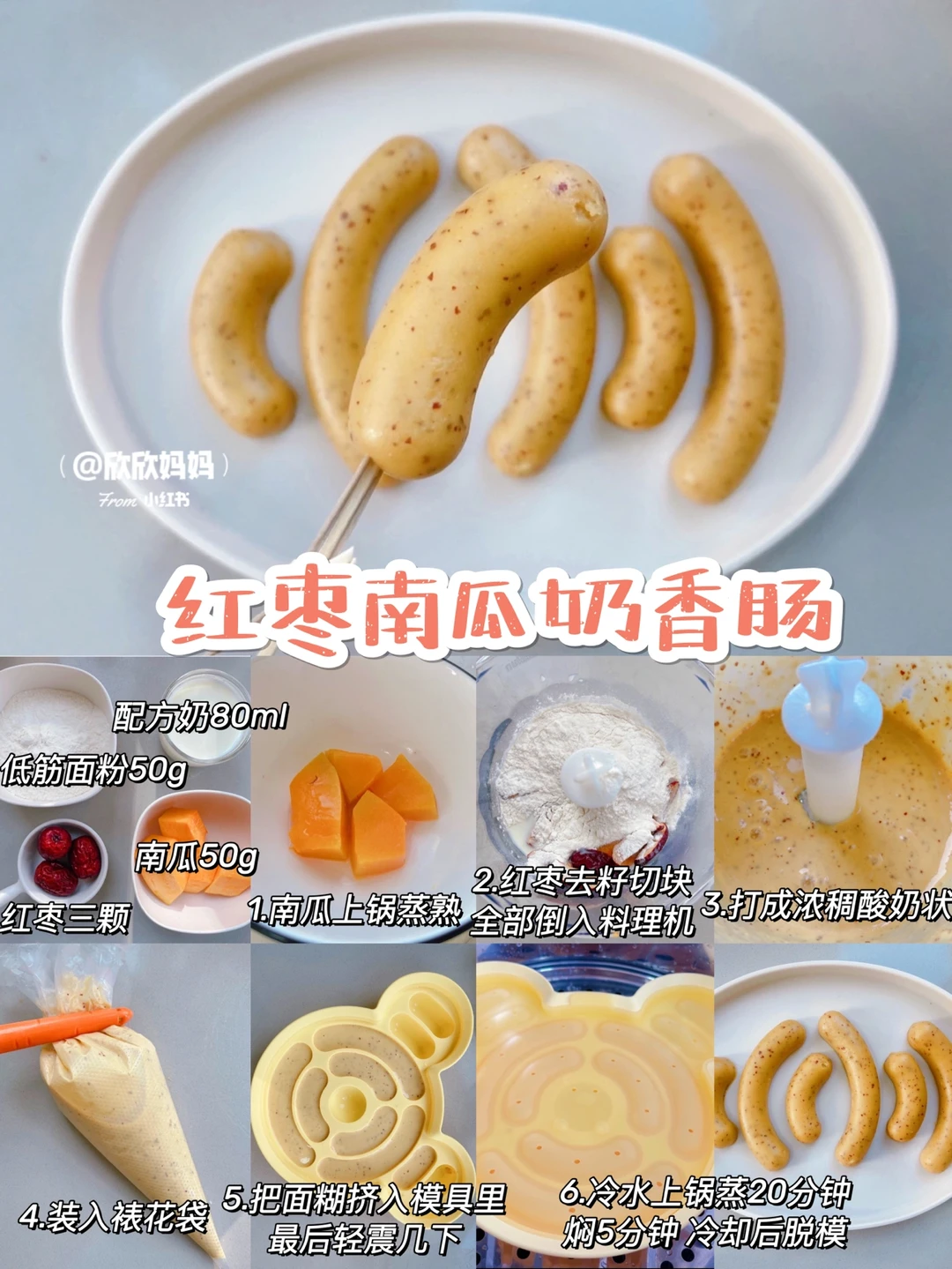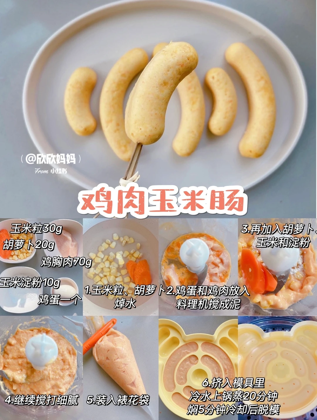 开始吃辅食之后的一两个月就可以慢慢添加手指食物啦!今天整理6款好吃又营养的辅食香肠,可以锻炼宝宝的抓握能力和咀嚼能力哦。 - 🌽鸡肉玉米肠 ✅食材:玉米粒30g、胡萝卜20g、鸡胸肉70g、玉米淀粉10g、鸡蛋一个 1️⃣:玉米粒和胡萝卜锅中焯水 2️⃣:鸡肉和鸡蛋倒入料理机搅打成肉泥 3️⃣:再加入胡萝卜、玉米粒和淀粉搅打细腻,装入裱花袋, 4️⃣:挤入刷好油(辅食油)的模具里,最后轻震几下,冷水上锅蒸20分钟焖5分钟冷却后脱模 - 🎃红枣南瓜奶香肠 ✅食材:红枣3颗、南瓜50g、低筋面粉50g、配方奶80ml 1️⃣:南瓜上锅蒸熟 红枣去籽切块 2️⃣:所有食材倒入料理机搅打成浓稠酸奶状 3️⃣:装入裱花袋,挤入刷好油(辅食油)的模具里,最后轻震几下,冷水上锅蒸20分钟焖5分钟冷却后脱模 - 🥔菠菜土豆肠 ✅食材:土豆100g、菠菜50g、低筋面粉25g、蛋黄一个 1️⃣:土豆上锅蒸熟、菠菜锅中焯水2分钟 2️⃣:所有食材倒入料理机加入20ml水,搅打成细腻的酸奶状 3️⃣:装入裱花袋,挤入刷好油(辅食油)的模具里,最后轻震几下,冷水上锅蒸20分钟焖5分钟冷却后脱模 - 奶香紫薯肠 ✅食材:紫薯60g、配方奶50ml、低筋面粉30g 1️⃣:紫薯上锅蒸熟 2️⃣:所有食材倒入料理机搅打细腻 3️⃣:装入裱花袋,挤入刷好油(辅食油)的模具里,最后轻震几下,冷水上锅蒸20分钟焖5分钟冷却后脱模 - 🎃奶香南瓜肠 ✅食材:胚芽米90g、南瓜30g、配方奶75ml 1️⃣:胚芽米提早浸泡3小时以上,南瓜上锅蒸熟 2️⃣:所有食材倒入料理机搅打成酸奶状并且有大气泡的糊糊 3️⃣:装入裱花袋,挤入刷好油的模具里,最后轻震几下,冷水上锅蒸20分钟焖5分钟冷却后脱模 - 🌽玉米胡萝卜猪肉肠 ✅食材:玉米粒40g、胡萝卜20g、鸡蛋一个、玉米淀粉20g、猪里脊40g 1️⃣:猪里脊用姜片柠檬片腌制15分钟去腥 2️⃣:所有食材倒入料理机搅打成细腻的糊糊 3️⃣:装入裱花袋,挤入刷好油的模具里,最后轻震几下,冷水上锅蒸20分钟焖5分钟冷却后脱模 辅食模具:ikv ⚠️八月龄是宝宝锻炼手指的最佳食物,多给宝宝做些手指食物锻炼抓握能力,自主进食慢慢就可以学会啦 宝宝手指食物|宝宝辅食香肠|