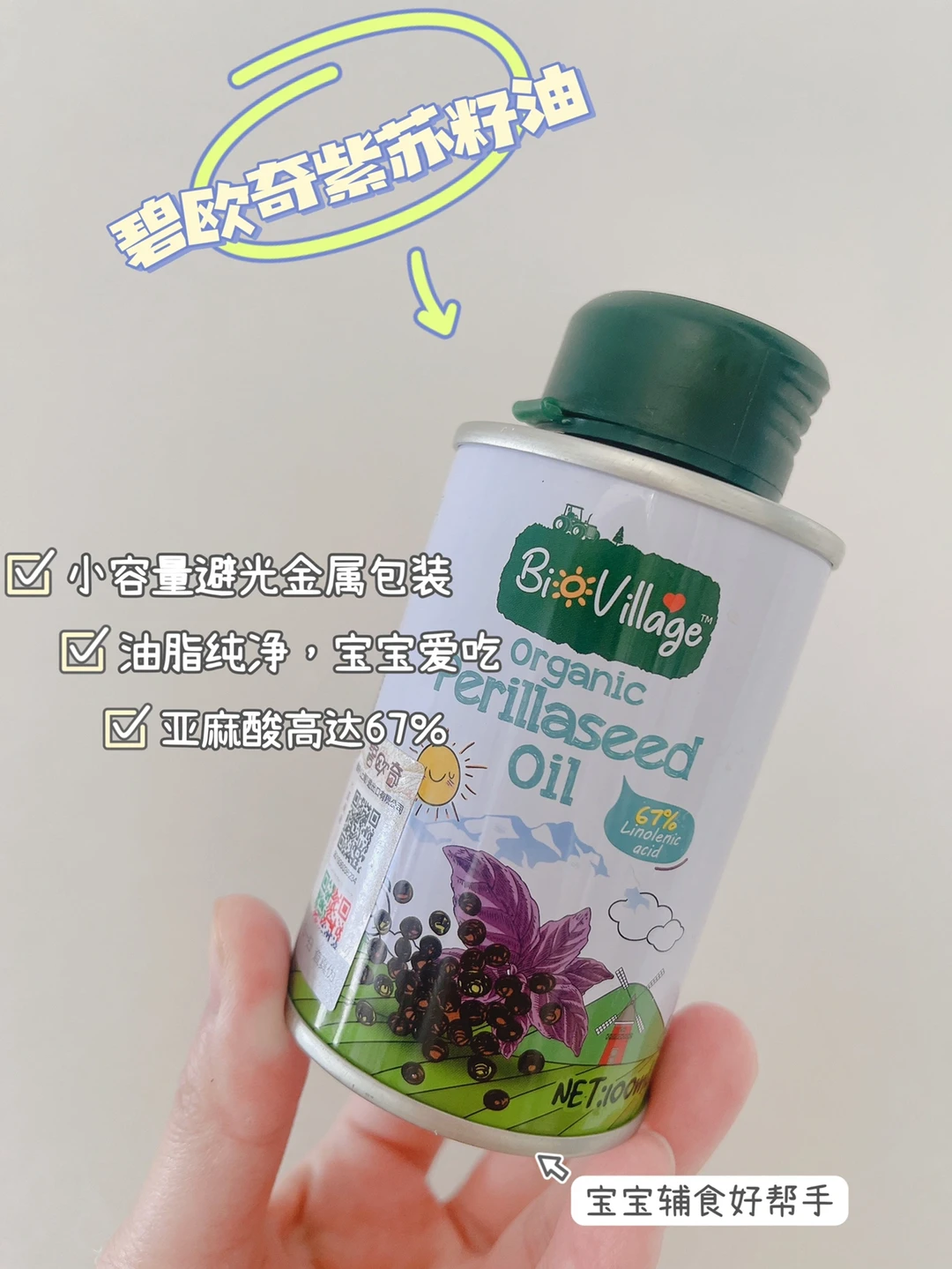宝宝在添加辅食的半个月后就可以添加辅食油啦!碧欧奇的紫苏籽油也是我一直在用的,它家紫苏籽油没苦味,油质纯,它的亚麻酸高达67%,无论给宝宝直接加进米粉里或粥、面条里,宝宝更爱吃哦!并且是国家一级紫苏籽油,而且是金属包装,能百分百完美避光,能更好的保存!