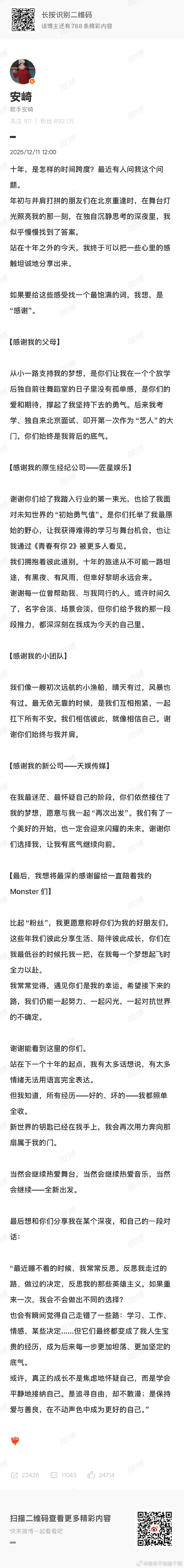 安崎官宣签约天娱 双向奔赴的绝佳选择!安崎的飒爽舞台范儿撞上天娱的专业运作,这场合作太让人期待了!