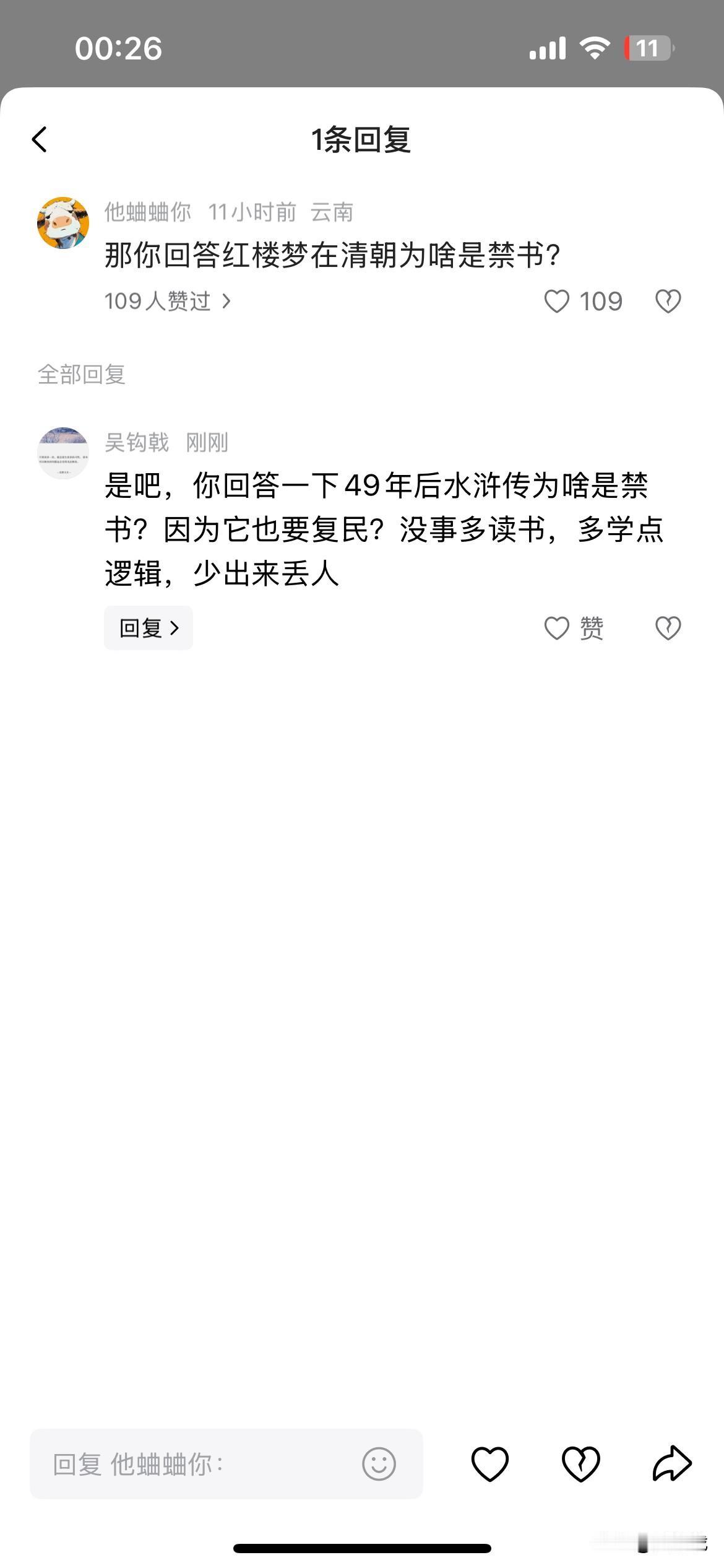 《红楼梦》在清朝什么时候成禁书了? 西方伪史论这帮玩意儿又跑去研究红楼梦了,这帮玩意儿的逻辑永远是非此即彼那么简单。 怪不得会被吃丝蒙主宣扬的那些毫无逻辑的东西蛊惑,会被它包装后的日本右翼思想迷惑,凡事了解点历史的,多思考点都知道这帮玩意儿和近代鬼子宣扬的东西一模一样。