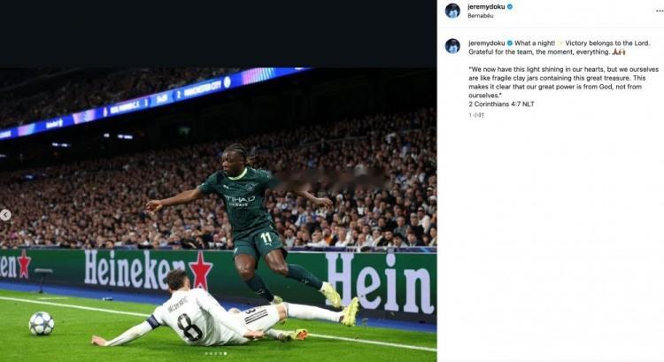欧冠联赛阶段第6轮,曼城客场2比1击败皇马。其中多库6次成功过人,全场最高。赛后,多库更新社媒晒照庆祝球队胜利。多库写道:多么美妙的夜晚!✨胜利属于主。对团队、这一刻、所有的一切都心怀感恩。🙏🏾🙌🏾“我们现在心里有这光照耀,但我们自己好像脆弱的瓦器,里面却盛着这无比珍贵的宝藏。这样就显明,这极大的能力是来自神,而不是来自我们自己。”——《哥林多后书》