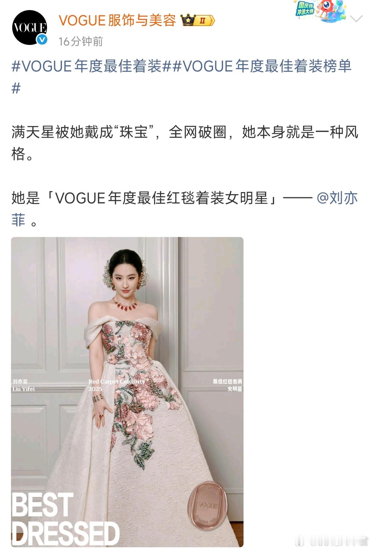 VOGUE年度最佳红毯着装女明星,刘亦菲上榜!全网破圈的满天星造型!完全意料之中的年度最佳VOGUE年度最佳着装