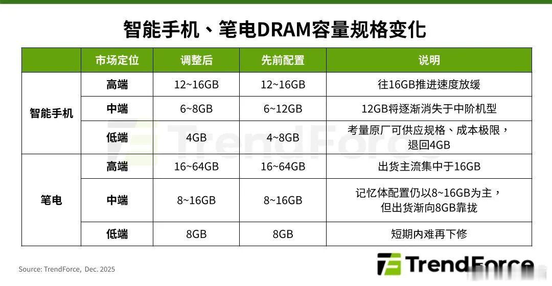 TrendForce:预计2026年一季度内存涨价,中端机12GB 内存逐渐消失、低端手机退回到4GB……
