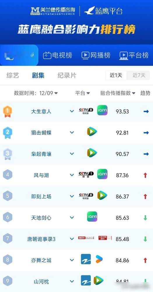 今天蓝鹰融合影响力剧集榜(12.09数据)!《大生意人》在CCTV8+爱奇艺双平台拿下93.53的传播指数,稳稳占住榜首;《狙击蝴蝶》《枭起青壤》紧随其后,腾讯视频这两部剧指数都破了90。 我看了一圈,就是蓝鹰那边放出了最新榜单,各家平台的剧一起比热度,谁升谁降一目了然。 最先跳进我视线的竟然是后面那波涨势,《风与潮》和《即刻上场》都往上冲,组合平台不一样,但都挺有劲儿。我觉得这种联播模式有时候真的能带来意外加成。 反倒是指数回落的《天地剑心》和《山河枕》,有点像前期冲太猛,现在进入平稳期。我感觉这种波动挺正常,但就看后续剧情能不能把盘面拉回来。 再回头看榜首,《大生意人》能稳着,我猜跟它的双平台覆盖有关,扩散速度确实快。这个现象每次都会让我想到,多平台联动对剧集到底有多重要。 腾讯那边《狙击蝴蝶》《枭起青壤》同时破90也挺有意思,像是互相推着往上走。我隐约觉得观众口味在往更类型化那边靠。 还有个感受是,这波榜单变化挺密集的,不看两天就落后。我自己都开始怀疑是不是剧多到有点看不过来了。 总之,最近剧市确实很热闹,我这边是边看边挑,你们呢,手上在追哪个?