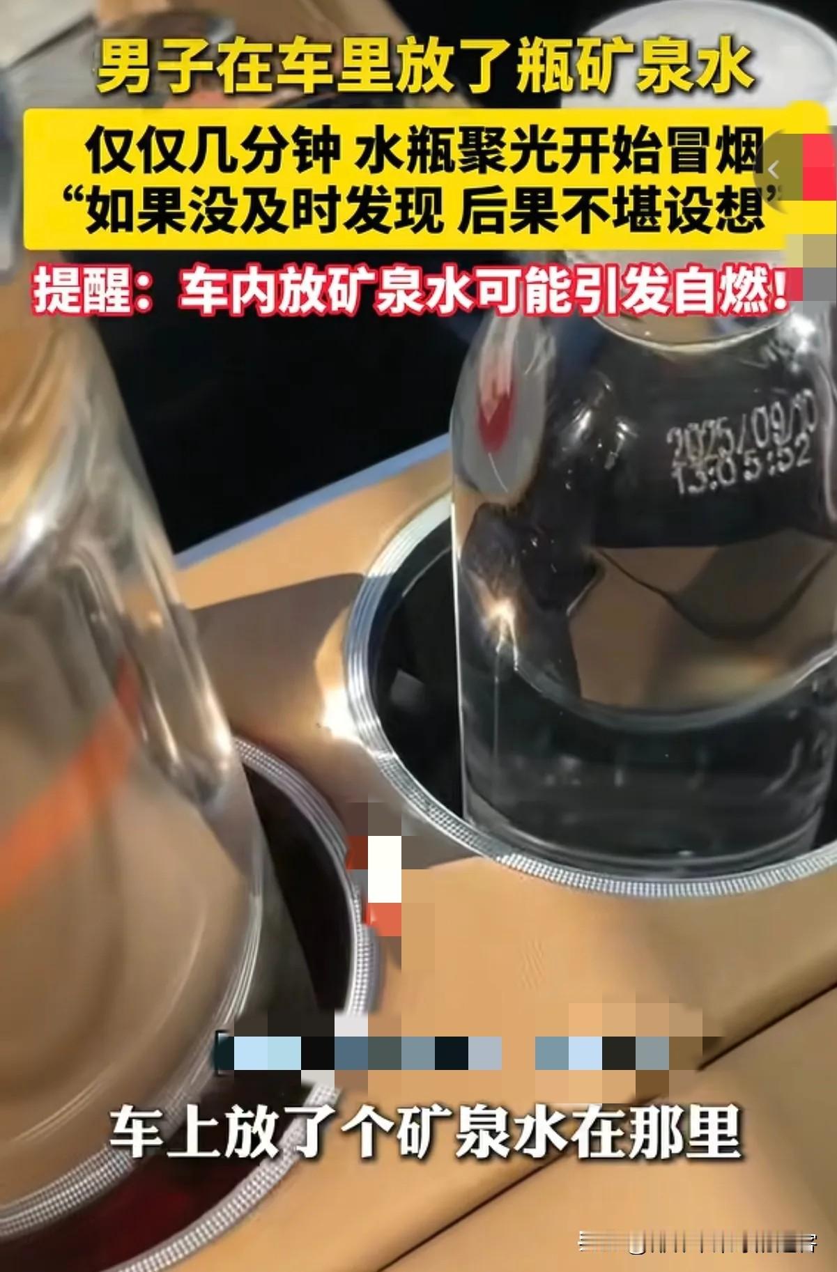 又是一起因瓶装水引发的自燃事故,司机的处理方式让人佩服。 事情发生在四川,司机行驶途中闻到车内有焦味,以为是车上卫生纸燃了,停车下来一看,才发现燃烧的是中央扶手位置的皮革。 原因是司机这天习惯在中央扶手位置放两瓶瓶装水,且这天阳光正好照射到中央扶手位置,透过瓶装水产生折射聚光,点燃了扶手上的皮革。 这名司机说,要不是他停车下来及时发现,后果不堪设想。 网友说了,光面的瓶装水还是放在避光处比较好。