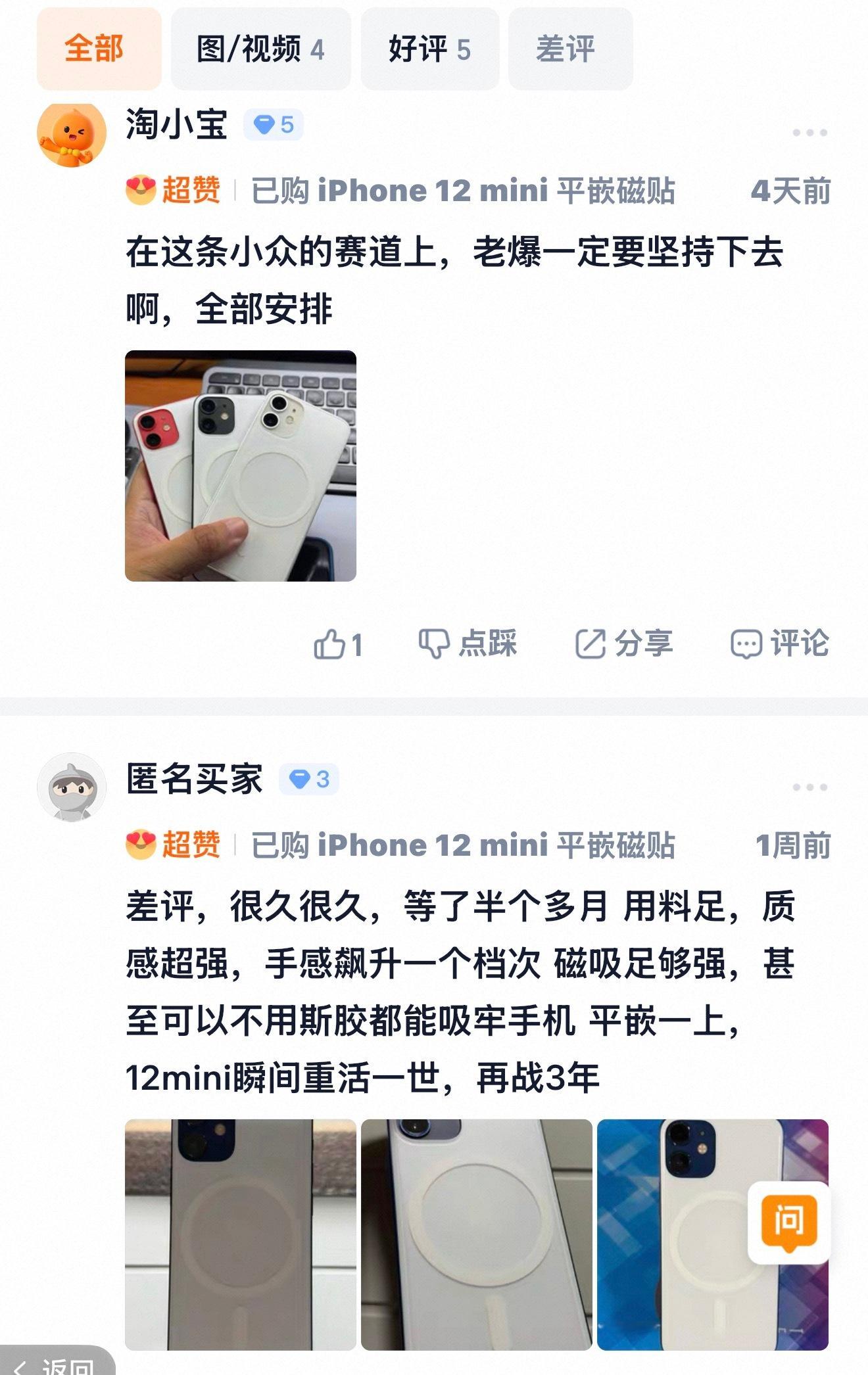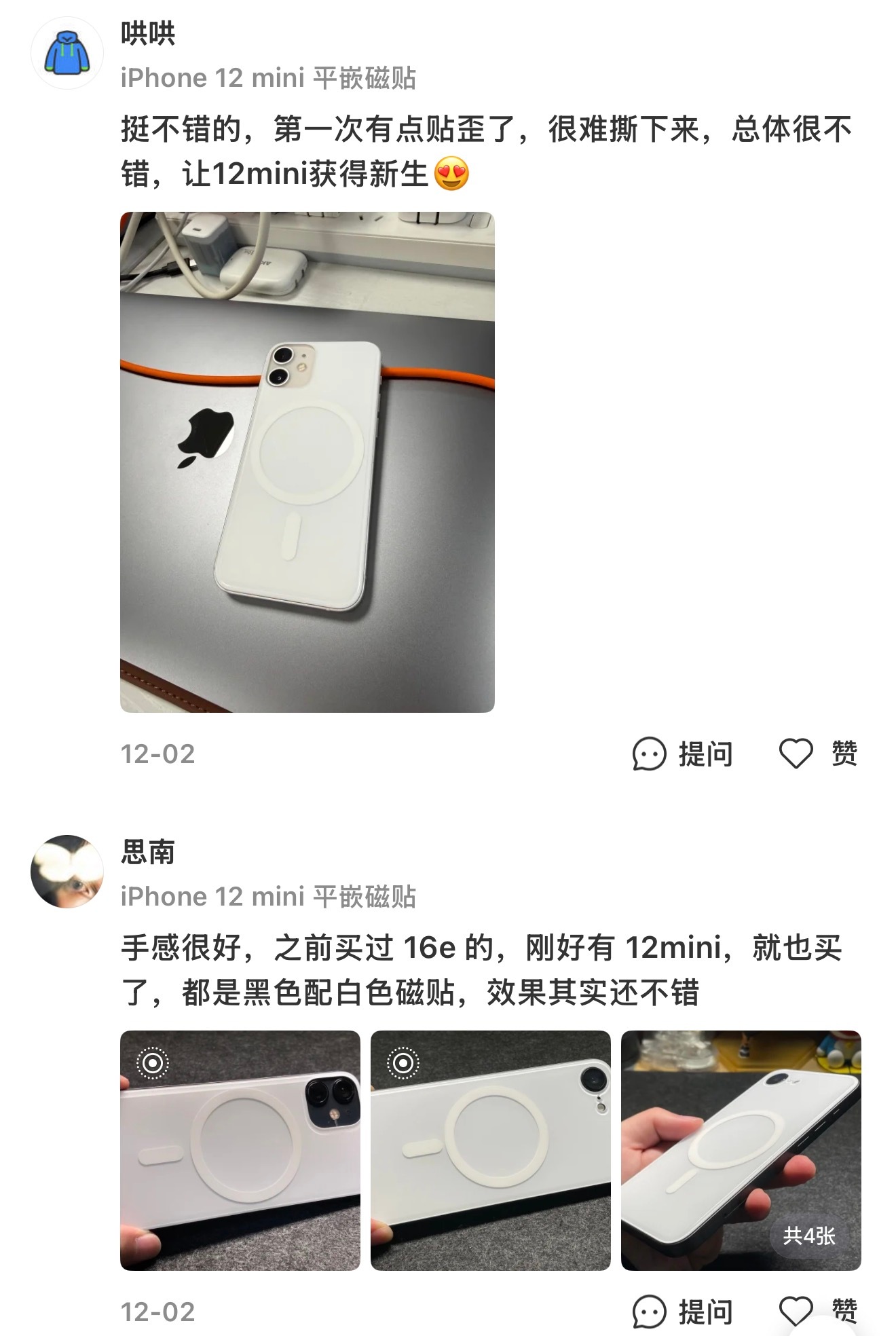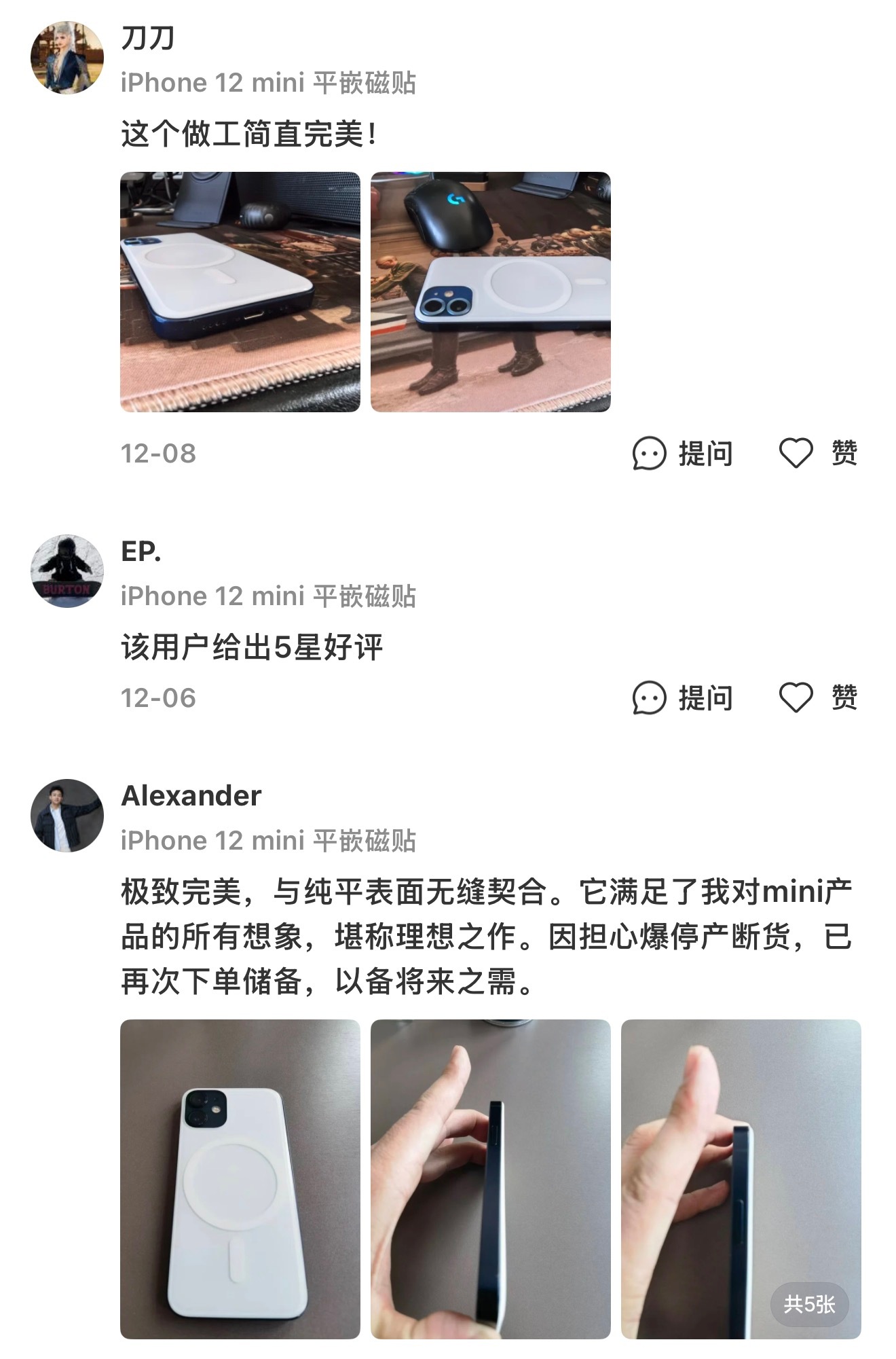 iPhone12mini 平嵌磁贴花了两个月时间才做出来,到现在也才卖了140个,但是我们收获了十几个走心的好评,还有好几个无返现无优惠纯自来水的小红书分享晒单。iPhone13mini 的平嵌磁贴正在稳步推进中。有很多朋友问我们做不做 xx 机型?我们都想做,但是时间和精力不太允许,我们优先做点老机型,做点自己手头有手机的。平嵌磁贴,给手机以新生 。