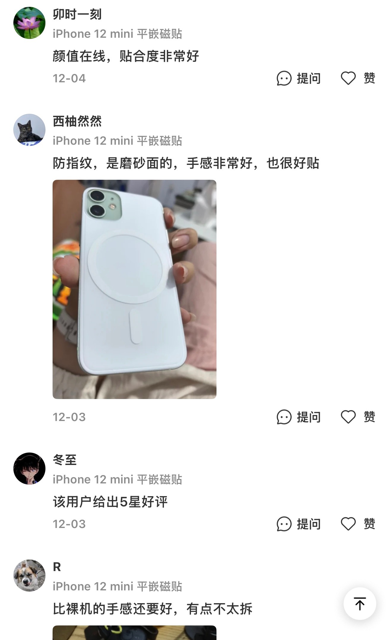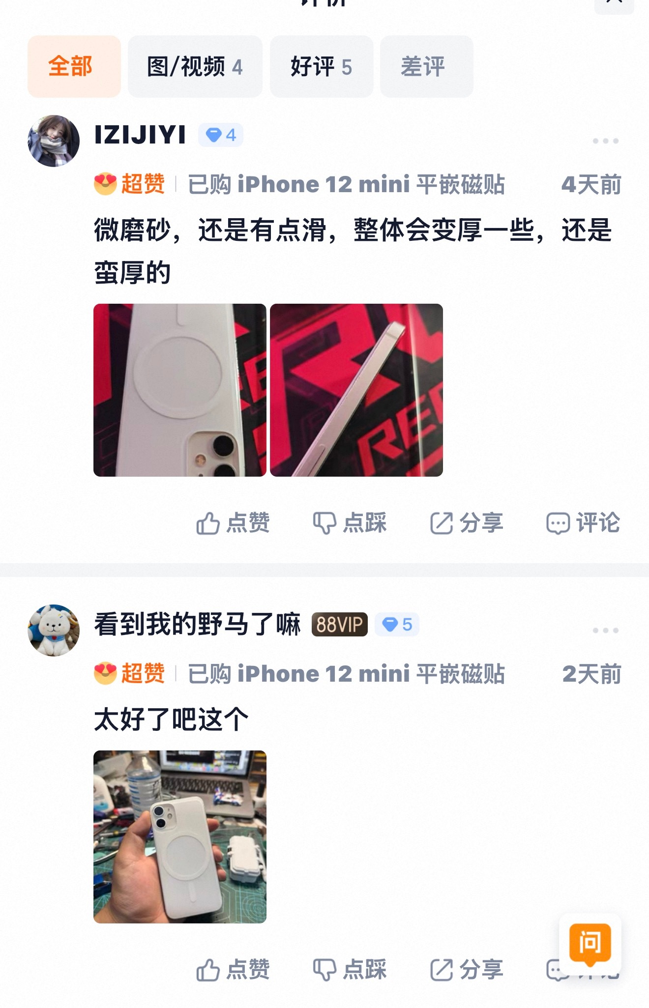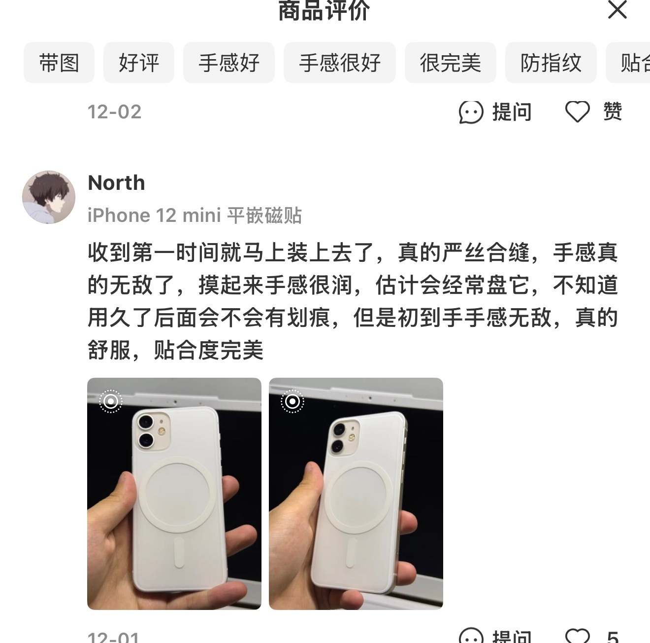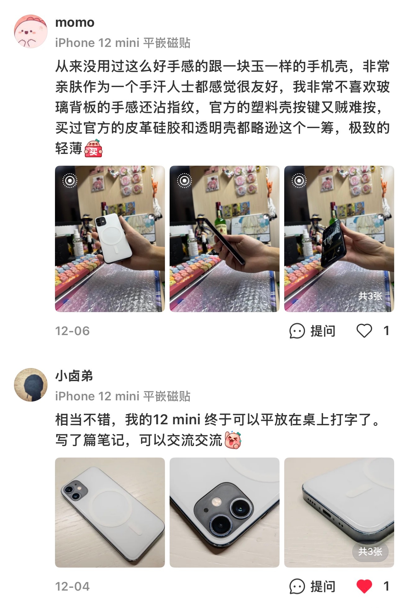 iPhone12mini 平嵌磁贴花了两个月时间才做出来,到现在也才卖了140个,但是我们收获了十几个走心的好评,还有好几个无返现无优惠纯自来水的小红书分享晒单。iPhone13mini 的平嵌磁贴正在稳步推进中。有很多朋友问我们做不做 xx 机型?我们都想做,但是时间和精力不太允许,我们优先做点老机型,做点自己手头有手机的。平嵌磁贴,给手机以新生 。