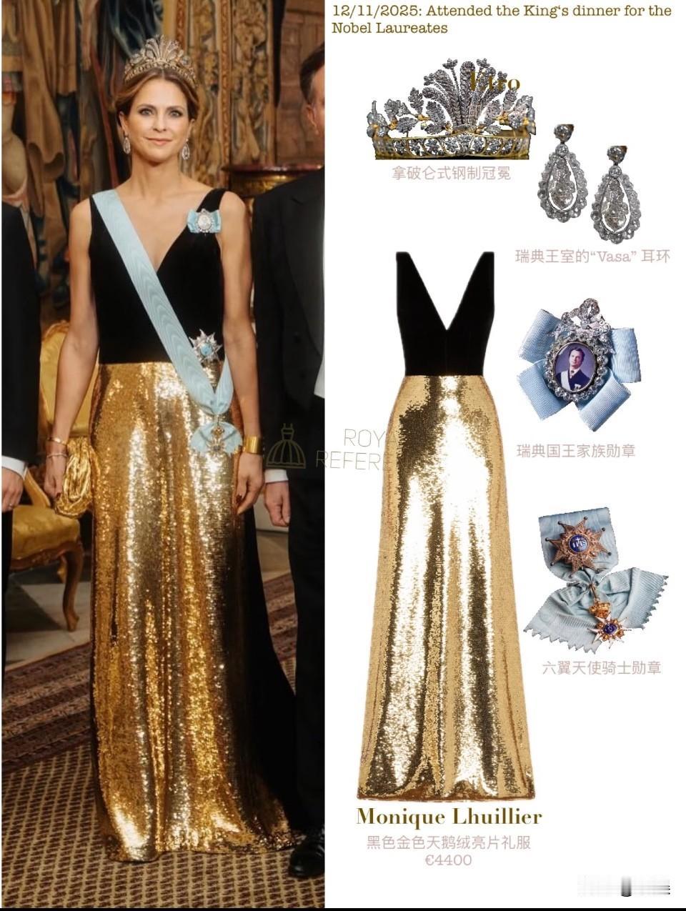(新)玛德琳公主诺贝尔皇家晚宴更惊艳 如果说昨天的诺贝尔颁奖典礼是更优雅更“公主”的场合,那么今晚由瑞典的古斯塔夫国王主持的诺贝尔获奖者皇家私人晚宴上,他最年轻的女儿小公主玛德琳就融入了更加摩登浓郁奢华的一面。 玛德琳公主选择了v领露胳膊的Monique Lhuillier的晚礼服,黑色的上身搭配金色的人鱼尾长裙,并且她戴着王室的cut-steel王冠,这顶“炸起来”的王冠也是博主最喜爱的瑞典王冠之一。和王室其它珠宝不一样,这个王冠上面没有钻石,是钢压制而成的花纹和造型。玛德琳公主 瑞典公主 瑞典王室