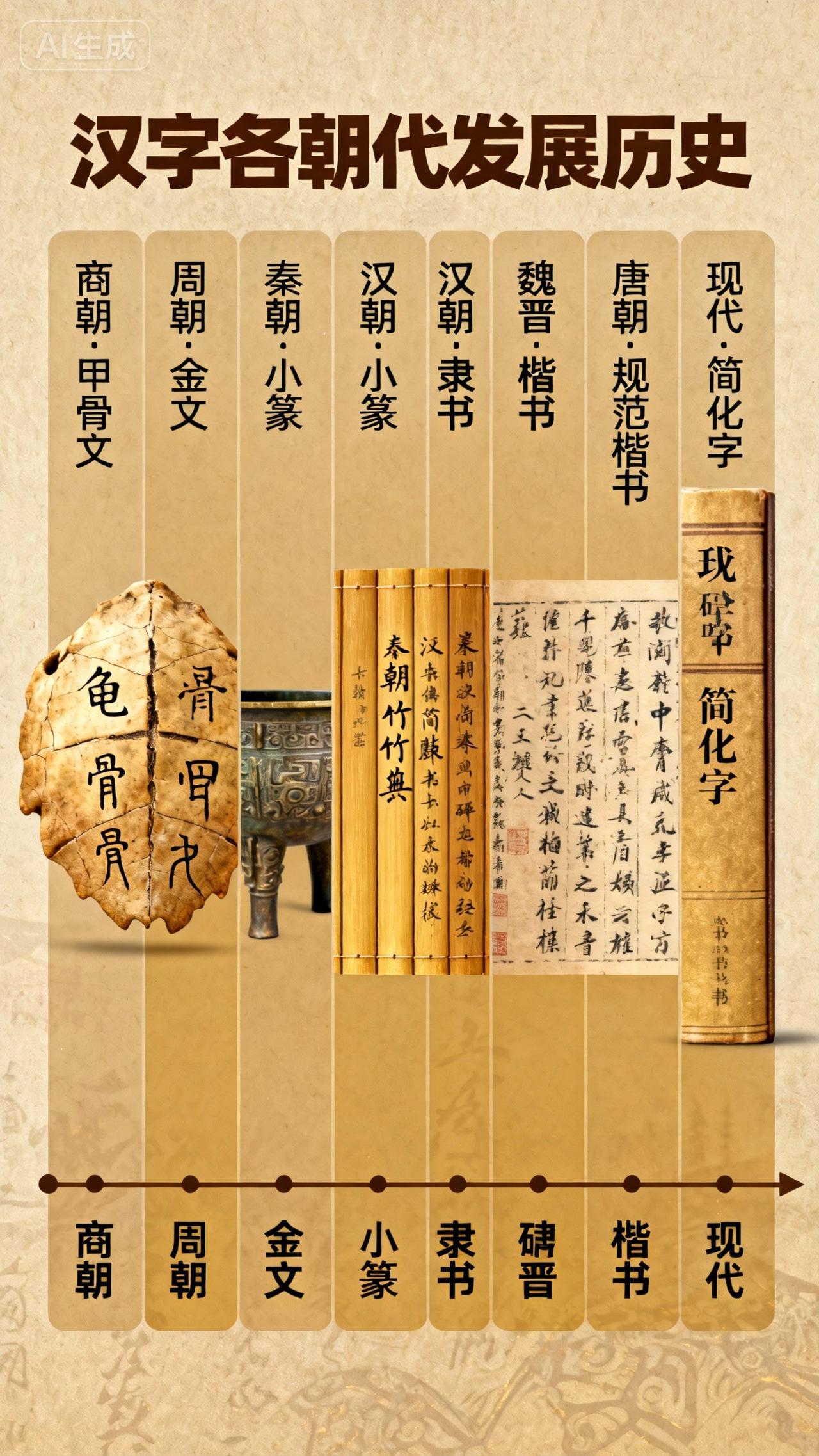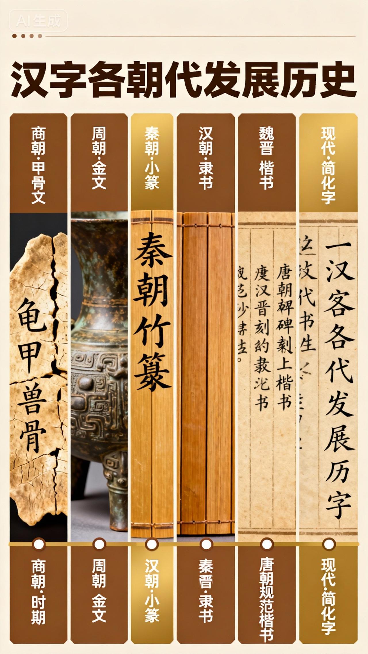 穿越4000年!汉字的朝代进化史,从甲骨文到网红字体太惊艳 作为世界上唯一未曾间断的文字,汉字的发展史就是一部鲜活的中华文明史!从刻在龟甲上的符号到如今的多元字体,每朝每代都给它刻下了独特印记,今天用通俗的话带你看懂这场跨越千年的“变形记”~ 汉字的源头藏在原始图画里,古人用简单线条描绘事物,慢慢演变成表意符号,这就是“书画同源”的由来。公元前14世纪的殷商时期,表意符号定型为甲骨文,刻在龟甲兽骨上用于占卜,五千多个发现的甲骨文里,至今还有一千多个能被解读,成为连接古今的文字密码。 西周时青铜器盛行,金文(钟鼎文)登场,刻在钟鼎石鼓上的文字古朴厚重,故宫现存的十个周代石鼓,就是当时的文字瑰宝。但诸侯割据让文字乱象丛生,直到秦朝统一,李斯整理简化文字,创造出规整的小篆,彻底结束了“文字异形”的局面,不过小篆书写繁琐,民间又衍生出方折平直的秦隶。 汉朝是汉字的大变革时代,汉隶完全摆脱小篆束缚,“蚕头雁尾”的笔法让书写更流畅,成为主流字体。同时楷书开始萌芽,到魏晋南北朝,王羲之父子将篆书的圆转与隶书的方正结合,去掉蚕头雁尾,确立了楷书的基本结构,“真书”从此成为书法楷模。 唐朝迎来汉字的黄金时代,楷书发展到顶峰,颜真卿、柳公权、欧阳询的书法成为千古典范。为了书写快捷和抒发情感,草书从章草演变为今草、狂草,笔势连绵奔放;介于楷草之间的行书则兼顾规范与流畅,成为最受欢迎的日常字体。 宋朝活字印刷术的发明催生了宋体,横细竖粗、方方正正的特点适配印刷需求,古朴端庄。随后仿宋体、黑体相继出现,黑体笔画均匀、醒目有力,成为标题首选,丰富了汉字的应用场景。 进入新中国,综艺体、浮云体等艺术字体层出不穷,汉字不仅是交流工具,更成为文化表达的载体。从甲骨文到今天的多元字体,汉字跨越千年依然充满活力,既维系着民族统一,又见证着文明繁荣。 这套跨越4000年的“文字进化史”是不是很震撼?评论区聊聊你最喜欢哪种字体,收藏起来,给孩子讲汉字故事超直观!