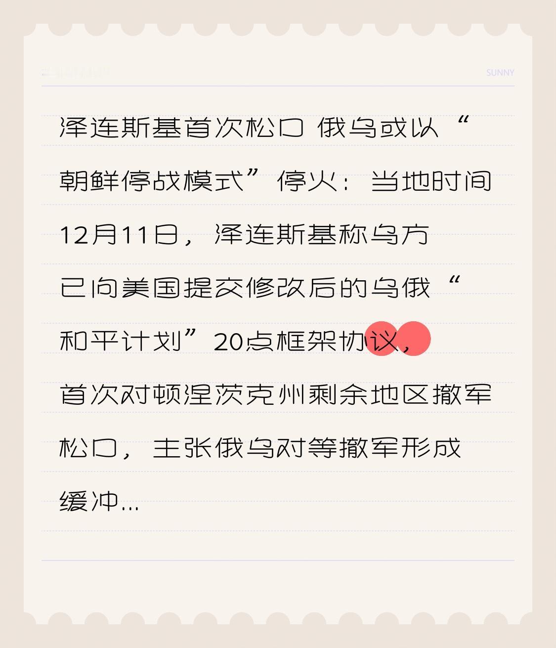 泽连斯基首次松口 俄乌或以“朝鲜停战模式”停火:当地时间12月11日,泽连斯基称乌方已向美国提交修改后的乌俄“和平计划”20点框架协议,首次对顿涅茨克州剩余地区撤军松口,主张俄乌对等撤军形成缓冲区且不交俄管辖;该方案本质是朝鲜停战模式,若美国斡旋满足俄关于北约、制裁等要求,和平计划或有达成可能。